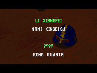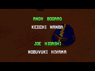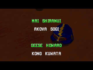| Terry B. | Andy B. | Billy Kane | Duck King | Geese H. | Joe Higashi | Kim K. | | Li Xiangfei | Mai S. | Mr. Karate | R. Yamazaki | - Raiden - | Toji S. | Tsugumi S. | | - If Geese Was The Last Boss - | If Mr. Karate Was The Last Boss | |