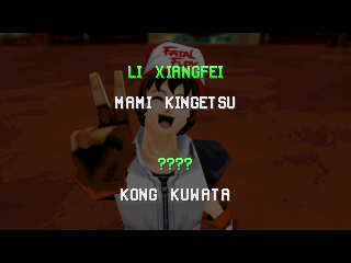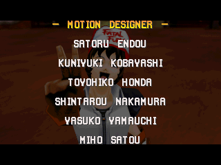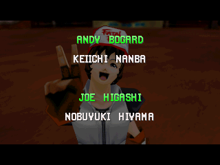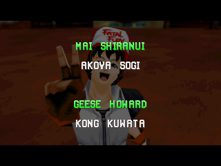 | Terry B. | Andy B. | Billy Kane | Duck King | Geese H. | Joe Higashi | Kim K. | | Li Xiangfei | Mai S. | Mr. Karate | R. Yamazaki | Raiden | Toji S. | - Tsugumi S. - | | - If Geese Was The Last Boss - | If Mr. Karate Was The Last Boss | |