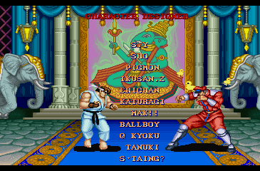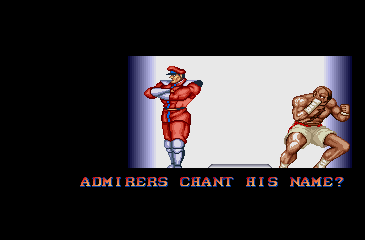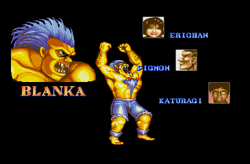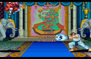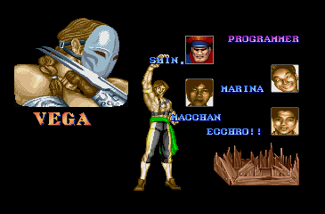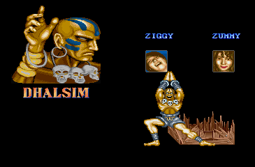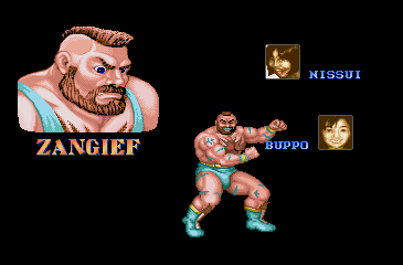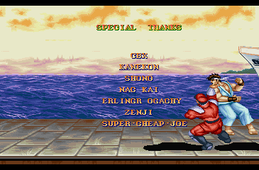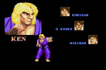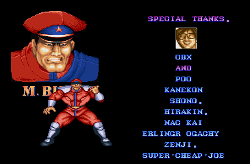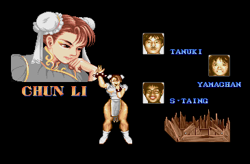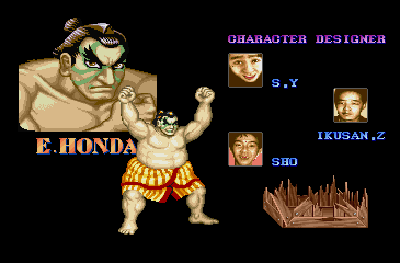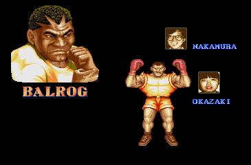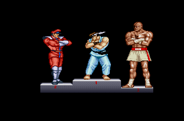 | - Ryu - | Ken | Chun Li | Guile | Blanka | Dhalsim | | E.Honda | Zangief | Balrog | Vega | Sagat | M.Bison | | Street Fighter II' The World Warrior | Street Fighter II' Champion Edition | - Street Fighter II' Hyper Fighting - | |