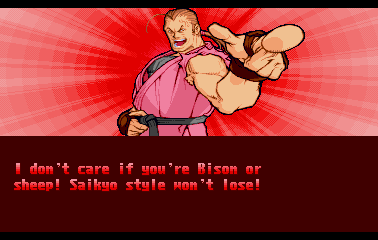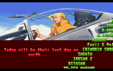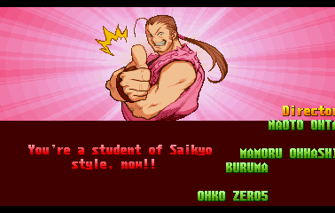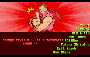 | Ryu | Evil Ryu | Ken | Guile | Charlie | Chun Li | Guy | Cody | Blanka | Dee Jay | Dhalsim | E.Honda | Fei Long | Gen | Juli | Juni | Karin | R.Mika | | Rolento | Rose | Sakura | Sodom | T.Hawk | Zangief | - Dan - | Cammy | Birdie | Adon | Balrog | Vega | Sagat | M.Bison | Akuma / Shin Akuma | | - Good Ending - | Bad Ending | | - Arcade Mode - | World Tour | Survival Mode | Dramatic Battle | |