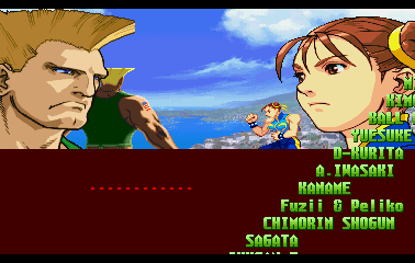 | Ryu | Evil Ryu | Ken | - Guile - | Charlie | Chun Li | Guy | Cody | Blanka | Dee Jay | Dhalsim | E.Honda | Fei Long | Gen | Juli | Juni | Karin | R.Mika | | Rolento | Rose | Sakura | Sodom | T.Hawk | Zangief | Dan | Cammy | Birdie | Adon | Balrog | Vega | Sagat | M.Bison | Akuma / Shin Akuma | | - Good Ending - | Bad Ending | | - Arcade Mode - | World Tour | Survival Mode | Dramatic Battle | |