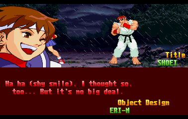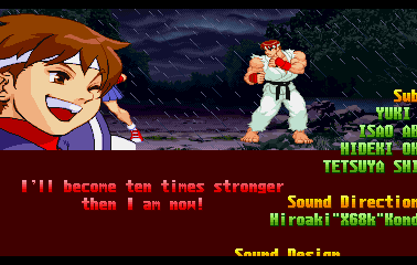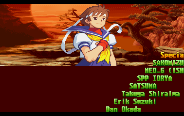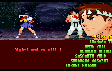 | Ryu | Evil Ryu | Ken | Guile | Charlie | Chun Li | Guy | Cody | Blanka | Dee Jay | Dhalsim | E.Honda | Fei Long | Gen | Juli | Juni | Karin | R.Mika | | Rolento | Rose | - Sakura - | Sodom | T.Hawk | Zangief | Dan | Cammy | Birdie | Adon | Balrog | Vega | Sagat | M.Bison | Akuma / Shin Akuma | | - Good Ending - | Bad Ending | | - Arcade Mode - | World Tour | Survival Mode | Dramatic Battle | |