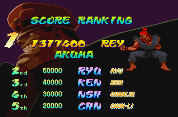 | Adon | - Akuma - | Birdie | Charlie | Chun-Li | Dan | Guy | Ken | M.Bison | Rose | Ryu | Sagat | Sodom | | - 4-8 Star Difficulty - | 1-3 Star Difficulty | | - If The Regular Last Boss Is Fought - | If Akuma Is The Last Boss | |