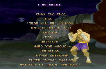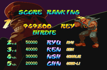 | Adon | Akuma | - Birdie - | Charlie | Chun-Li | Dan | Guy | Ken | M.Bison | Rose | Ryu | Sagat | Sodom | | - 4-8 Star Difficulty - | 1-3 Star Difficulty | | - If The Regular Last Boss Is Fought - | If Akuma Is The Last Boss | |