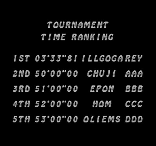 | Chuji | Epon | Fei | Gren | Hom | - Illgoga - | | Mary | Oliems | Mufu / Snork / Udan / Tori | | - Tournament Mode - | Quest Mode | |
