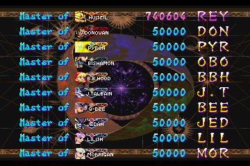 | Anakaris | Baby Bonnie Hood | Bishamon | Demitri | Donovan | Felicia | Hsien-Ko | - Huitzil - | J.Talbain | | Jedah | L.Rapter | Lilith | Morrigan | Oboro Bishamon | Pyron | Q-Bee | Rikuo | Sasquatch | Victor | | - Standard Mode - | Shadow / Marionette Mode | | - Vampire Savior Mode - | Vampire Savior 2 Mode | Vampire Hunter 2 Mode | |