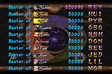 | Anakaris | Baby Bonnie Hood | Bishamon | Demitri | Donovan | Felicia | Hsien-Ko | Huitzil | - J.Talbain - | | Jedah | L.Rapter | Lilith | Morrigan | Oboro Bishamon | Pyron | Q-Bee | Rikuo | Sasquatch | Victor | | - Standard Mode - | Shadow / Marionette Mode | | - Vampire Savior Mode - | Vampire Savior 2 Mode | Vampire Hunter 2 Mode | |