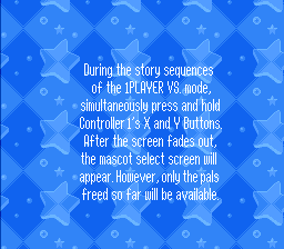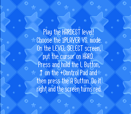 | - Hard/Super Hard - | Normal | Easy | | - Versus - | Stage Clear | Puzzle | Endless | | - 1 Player Game - | CPU Switch On | |