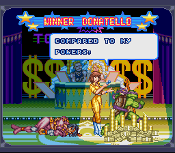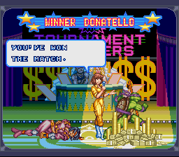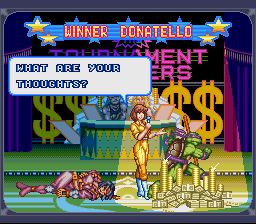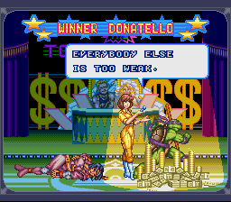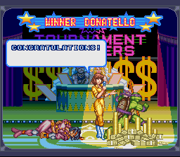 | Leo | - Don - | Raph | Mike | Aska | Armaggon | Wingnut | Chrome Dome | War | Shredder | | - Good Ending - | Bad Ending | | - Tournament - | Story Battle | |