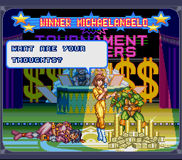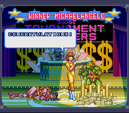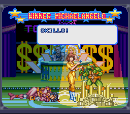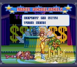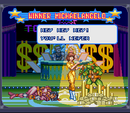 | Leo | Don | Raph | - Mike - | Aska | Armaggon | Wingnut | Chrome Dome | War | Shredder | | - Good Ending - | Bad Ending | | - Tournament - | Story Battle | |
