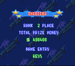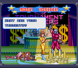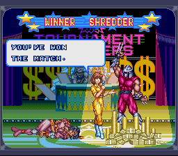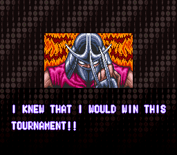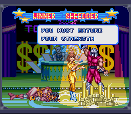 | Leo | Don | Raph | Mike | Aska | Armaggon | Wingnut | Chrome Dome | War | - Shredder - | | - Good Ending - | Bad Ending | | - Tournament - | Story Battle | |