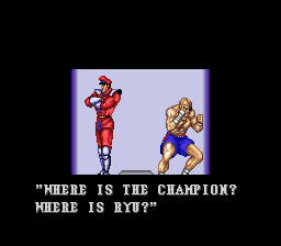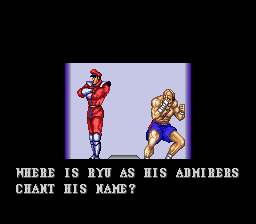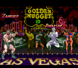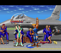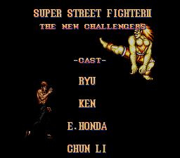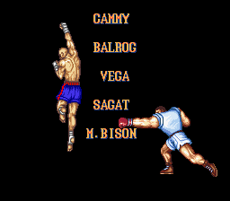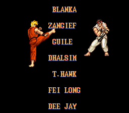 | - Ryu - | Ken | Chun Li | Blanka | Guile | Zangief | Dhalsim | E.Honda | | Fei Long | Cammy | T.Hawk | Dee Jay | Balrog | Vega | Sagat | M.Bison | | - Difficulty 4-8 - | Difficulty 1-3 | | - Super Battle - | Tournament Battle | |