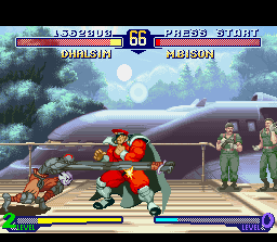 | Ryu | Ken | Sakura | Charlie | Dan | Zangief | Chun-Li | - Dhalsim - | Rolento | Guy | | Birdie | Gen | Katana | Adon | Rose | Sagat | M.Bison | Akuma | |