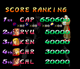 | Ryu | Ken | Sakura | Charlie | Dan | Zangief | Chun-Li | Dhalsim | Rolento | Guy | | Birdie | - Gen - | Katana | Adon | Rose | Sagat | M.Bison | Akuma | |
