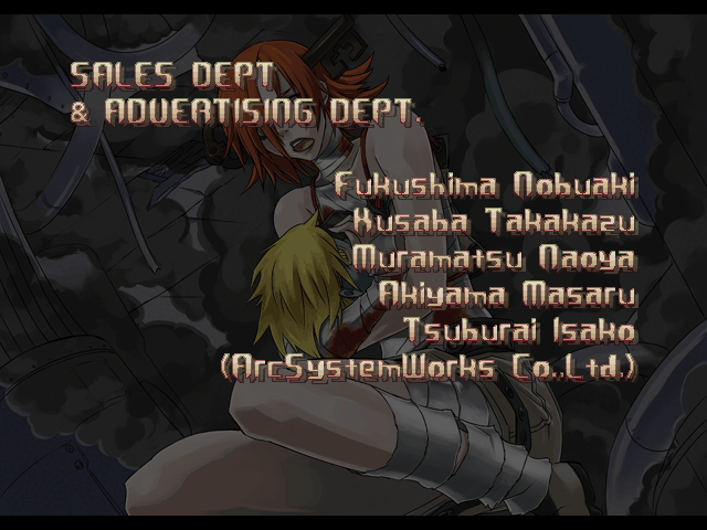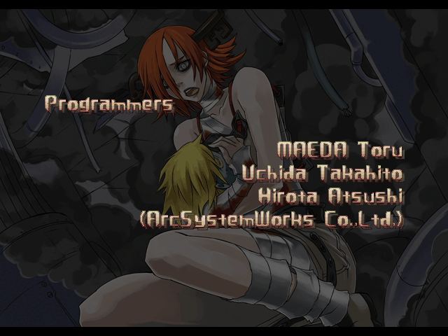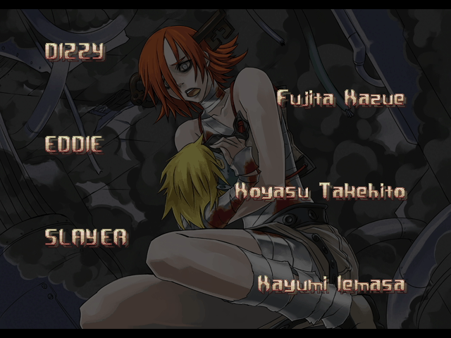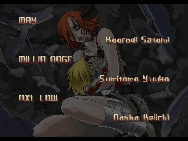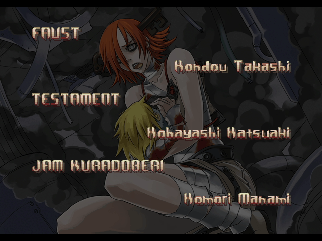 | If Your Final Opponent Is I-No | - If Your Final Opponent Is Dizzy - | | - A.B.A - | Anji-Mito | Axl Low | Baiken | Bridget | Chipp Zanuff | Dizzy | Eddie | Faust | I-No | Jam | Johnny | Justice | Kliff Undersn | | Ky-Kiske | May | Millia Rage | Order-Sol | Potemkin | Robo-Ky | Slayer | Sol-Badguy | Testament | Venom | Zappa | | Arcade Mode | - Story Mode - | |