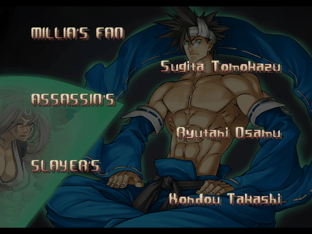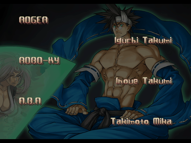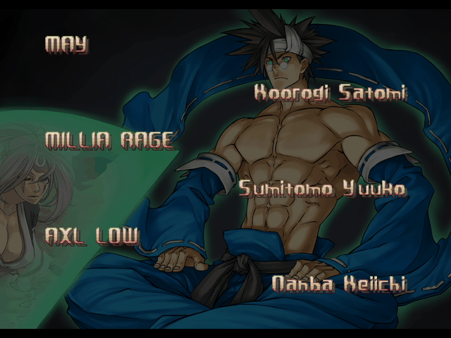 | If Your Final Opponent Is Baiken | If Your Final Opponent Is May | - If Your Final Opponent Is I-No - | | A.B.A | - Anji-Mito - | Axl Low | Baiken | Bridget | Chipp Zanuff | Dizzy | Eddie | Faust | I-No | Jam | Johnny | Justice | Kliff Undersn | | Ky-Kiske | May | Millia Rage | Order-Sol | Potemkin | Robo-Ky | Slayer | Sol-Badguy | Testament | Venom | Zappa | | Arcade Mode | - Story Mode - | |