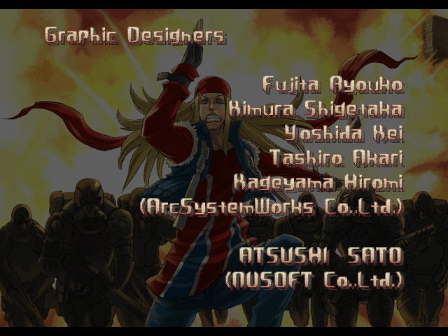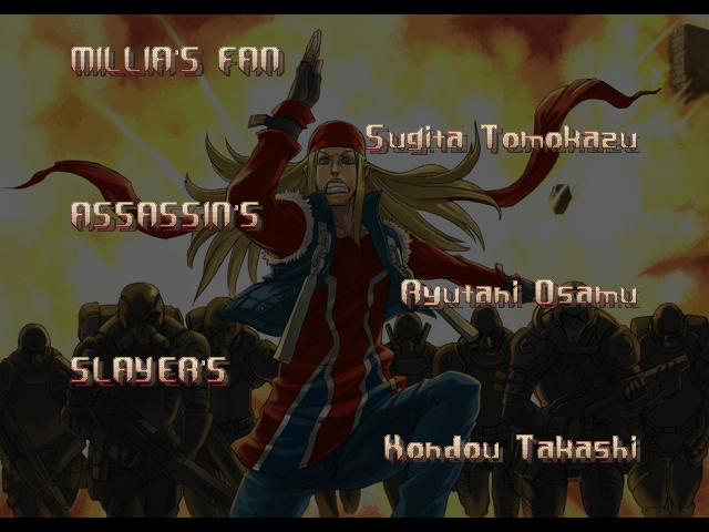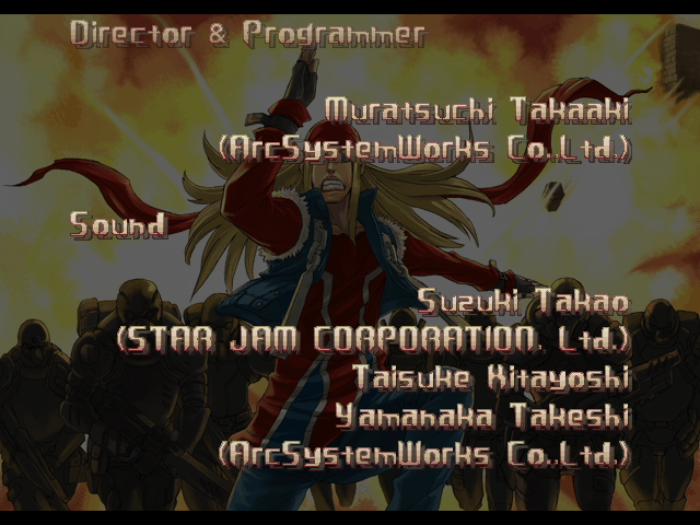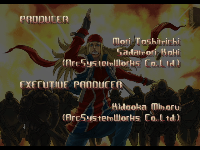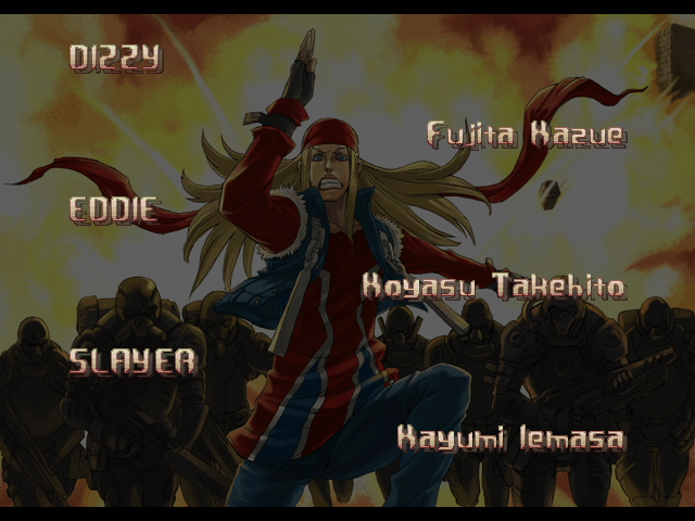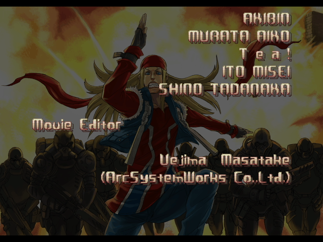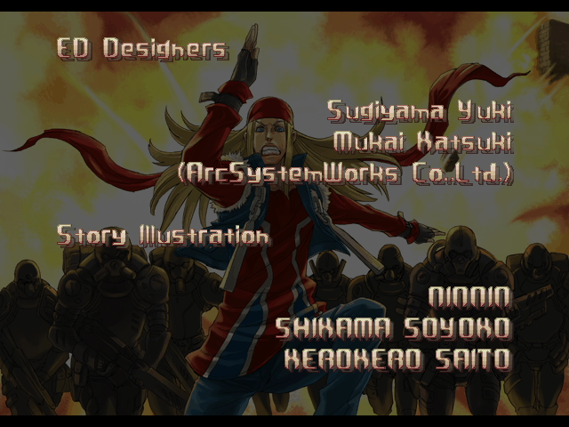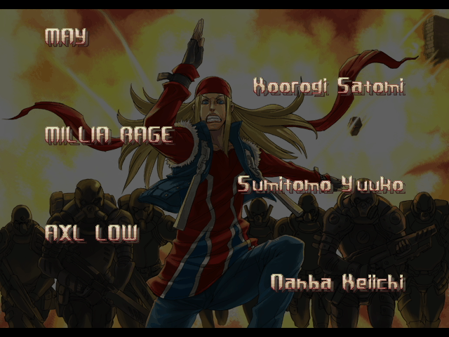 | If Your Final Opponent Is Justice | - If You Defeat Axl Low With An Instant Kill - | If Your Final Opponent Is Anji-Mito | | A.B.A | Anji-Mito | - Axl Low - | Baiken | Bridget | Chipp Zanuff | Dizzy | Eddie | Faust | I-No | Jam | Johnny | Justice | Kliff Undersn | | Ky-Kiske | May | Millia Rage | Order-Sol | Potemkin | Robo-Ky | Slayer | Sol-Badguy | Testament | Venom | Zappa | | Arcade Mode | - Story Mode - | |