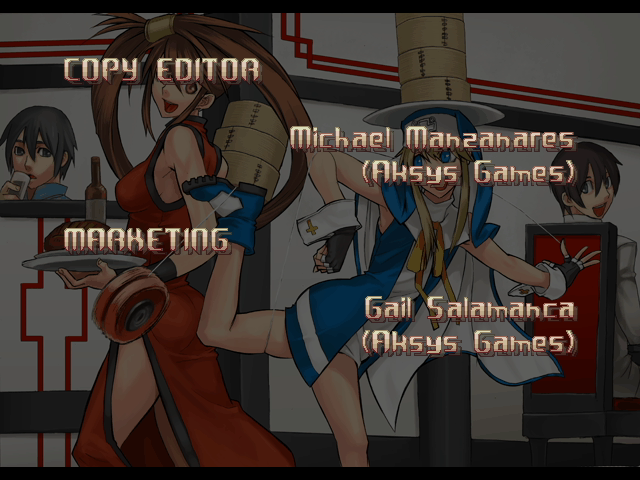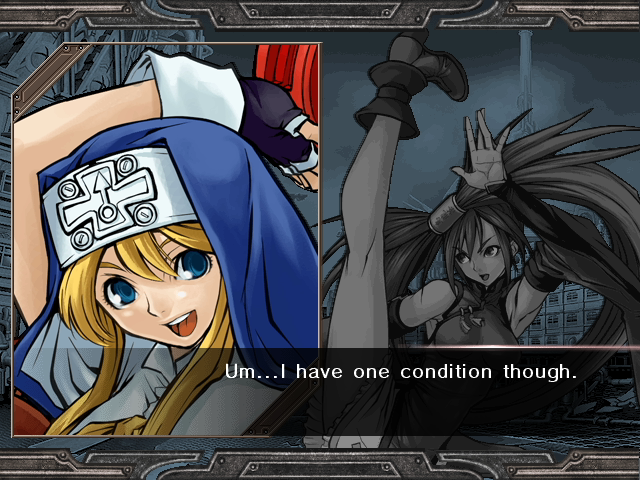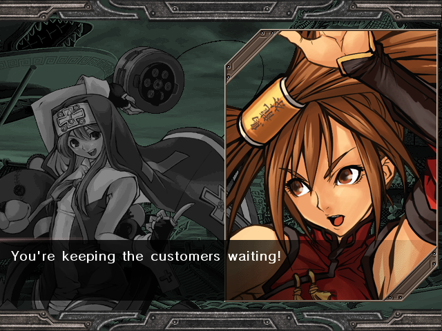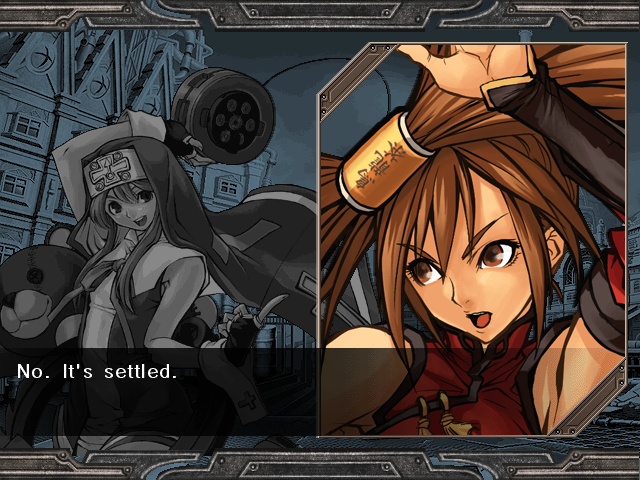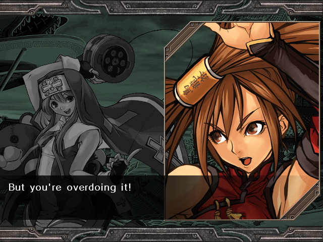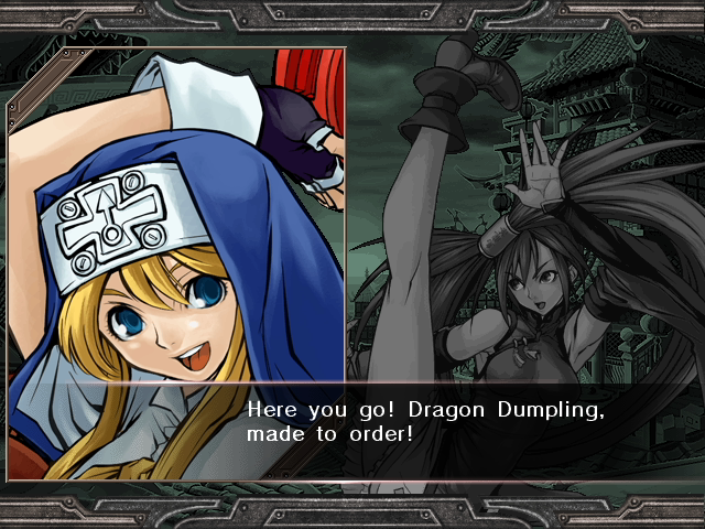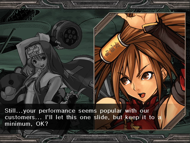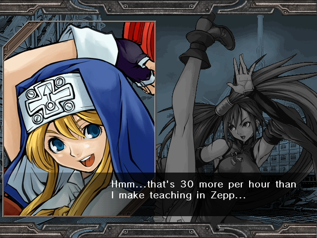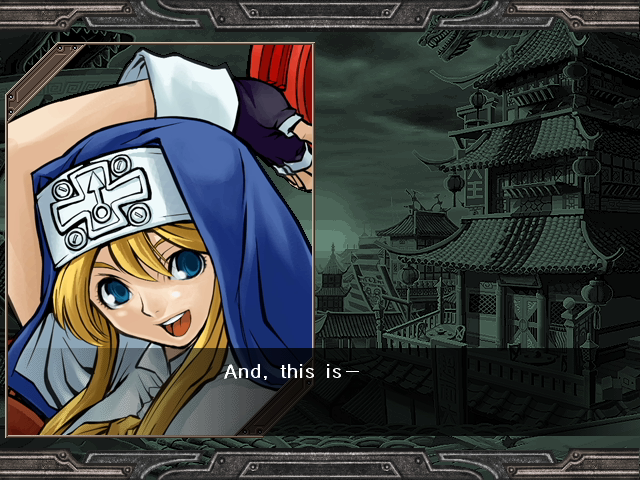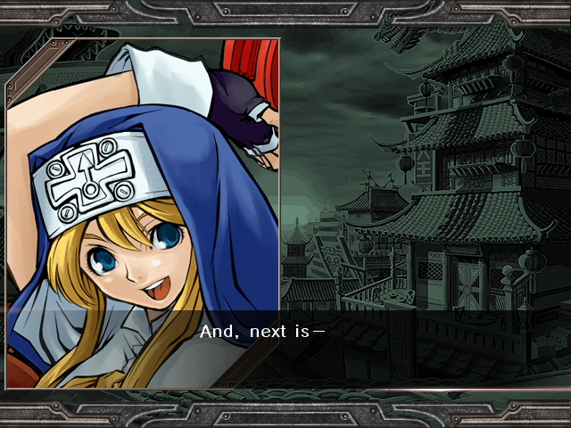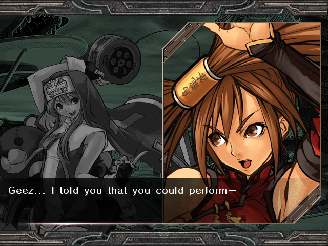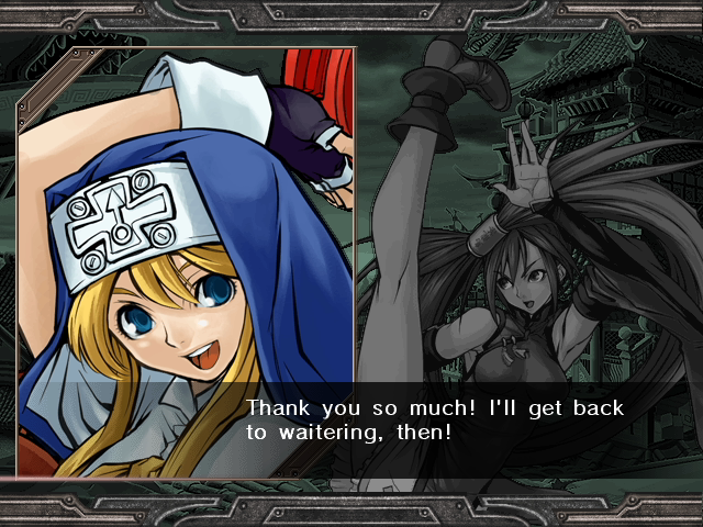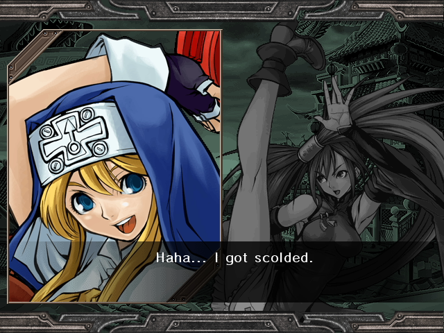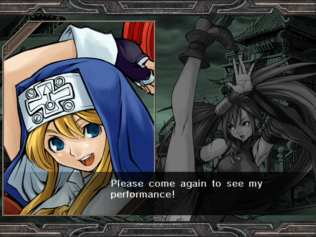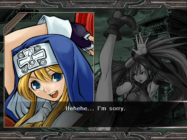 | Home | BackTweet | Arcade Mode | - Story Mode - | | A.B.A | Anji-Mito | Axl Low | Baiken | - Bridget - | Chipp Zanuff | Dizzy | Eddie | Faust | I-No | Jam | Johnny | Justice | Kliff Undersn | | Ky-Kiske | May | Millia Rage | Order-Sol | Potemkin | Robo-Ky | Slayer | Sol-Badguy | Testament | Venom | Zappa | | - If Your Final Opponent Is Jam - | If Your Final Opponent Is I-No |