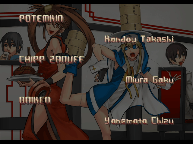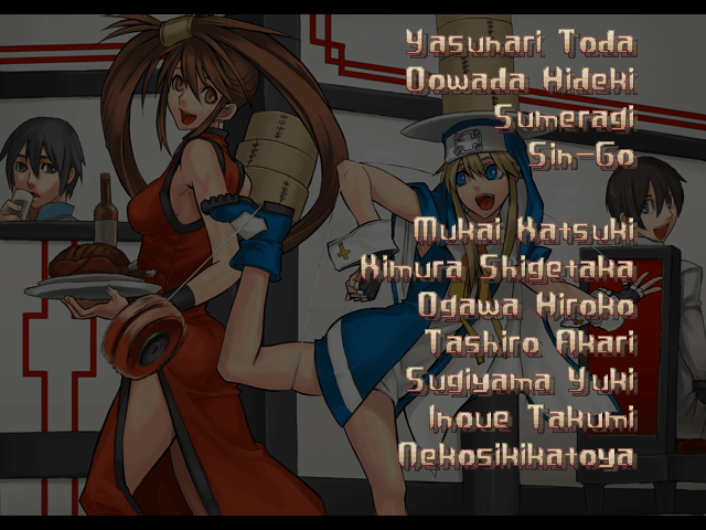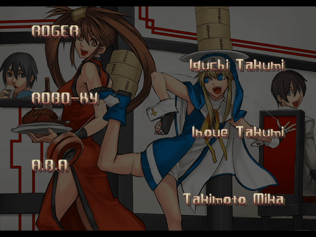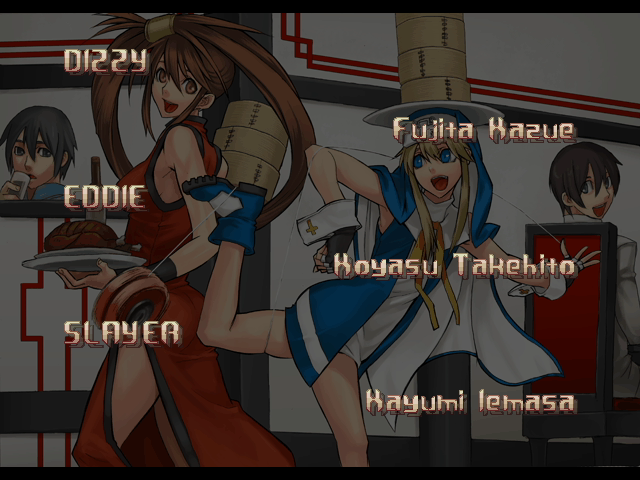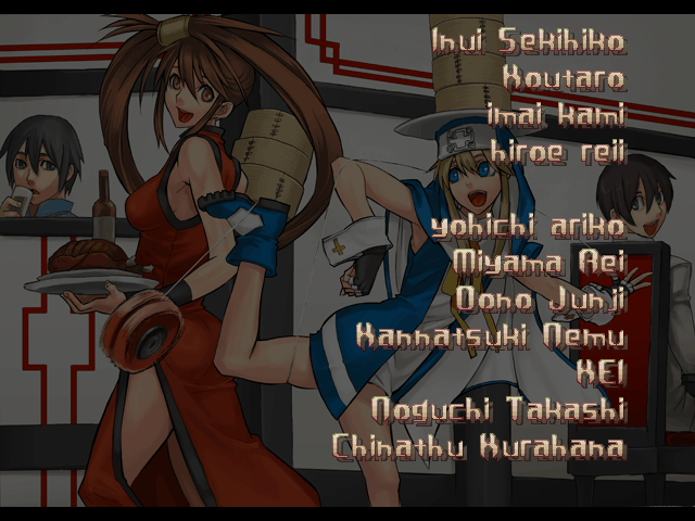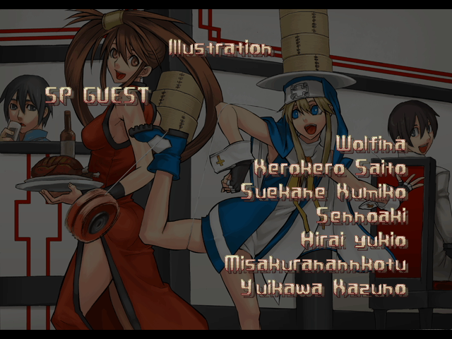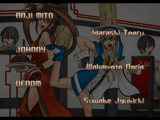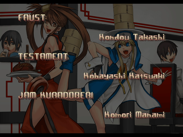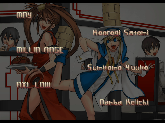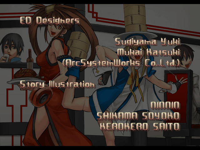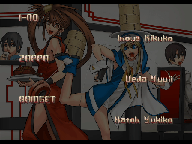 | - If Your Final Opponent Is Jam - | If Your Final Opponent Is I-No | | A.B.A | Anji-Mito | Axl Low | Baiken | - Bridget - | Chipp Zanuff | Dizzy | Eddie | Faust | I-No | Jam | Johnny | Justice | Kliff Undersn | | Ky-Kiske | May | Millia Rage | Order-Sol | Potemkin | Robo-Ky | Slayer | Sol-Badguy | Testament | Venom | Zappa | | Arcade Mode | - Story Mode - | |