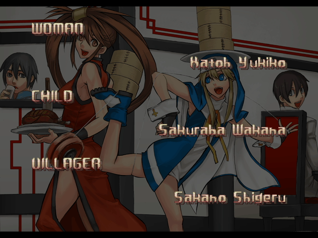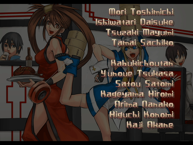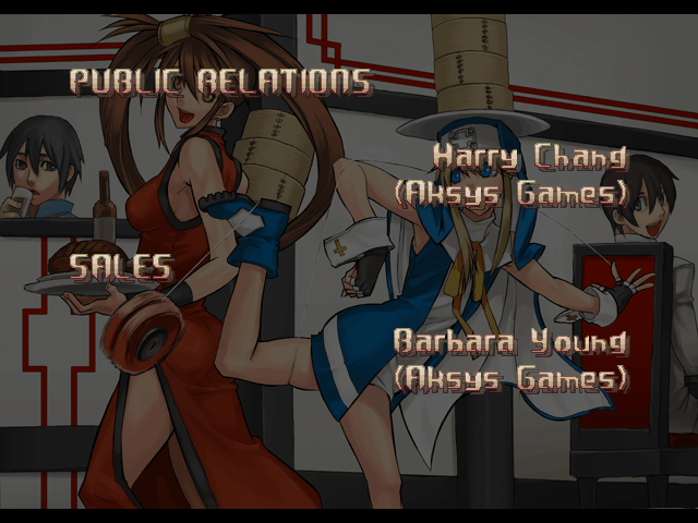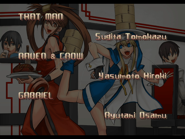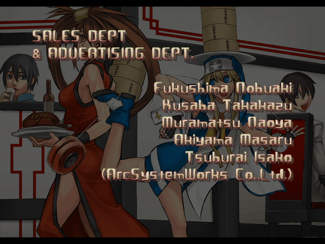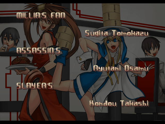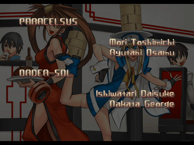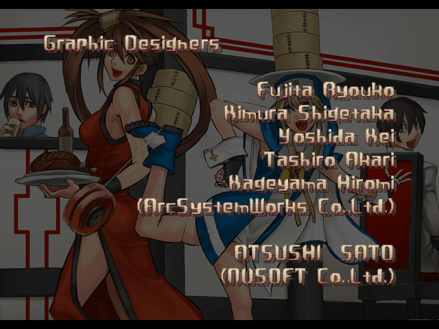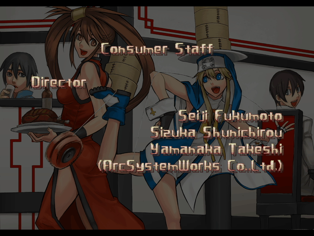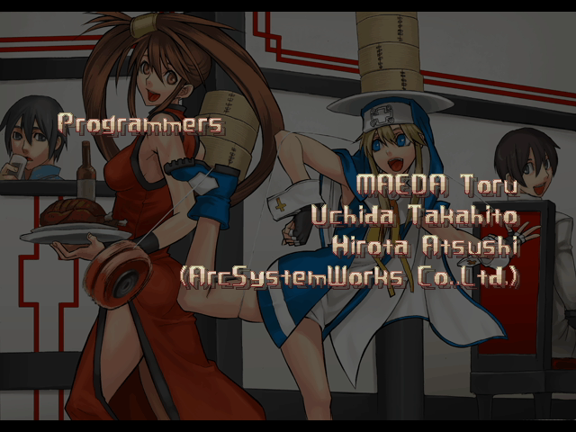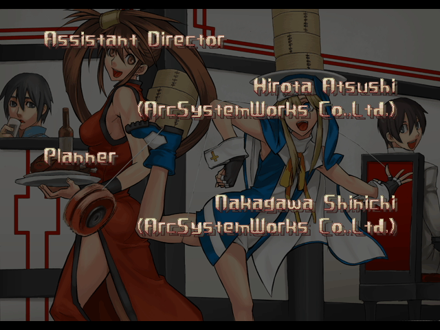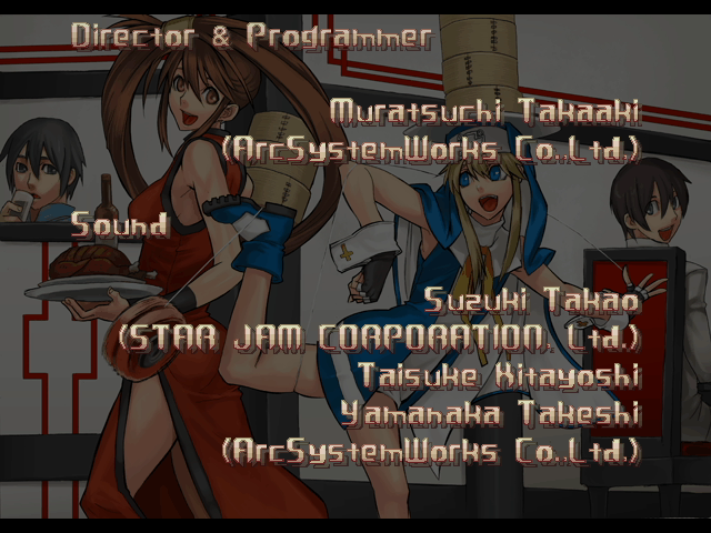 | - If Your Final Opponent Is Jam - | If Your Final Opponent Is I-No | | A.B.A | Anji-Mito | Axl Low | Baiken | - Bridget - | Chipp Zanuff | Dizzy | Eddie | Faust | I-No | Jam | Johnny | Justice | Kliff Undersn | | Ky-Kiske | May | Millia Rage | Order-Sol | Potemkin | Robo-Ky | Slayer | Sol-Badguy | Testament | Venom | Zappa | | Arcade Mode | - Story Mode - | |