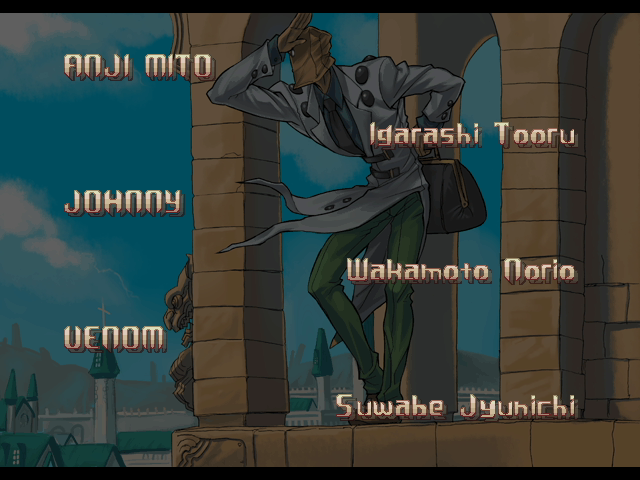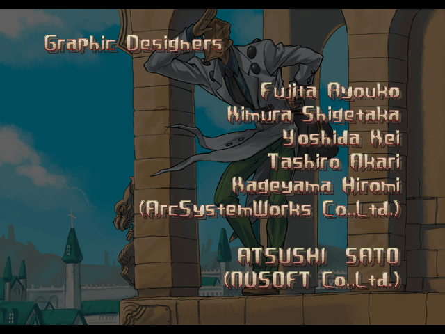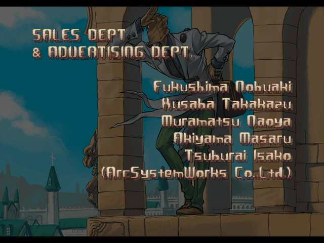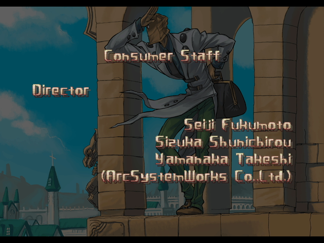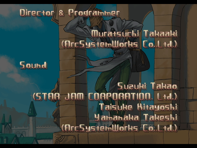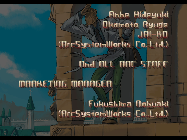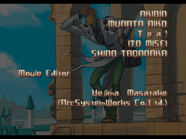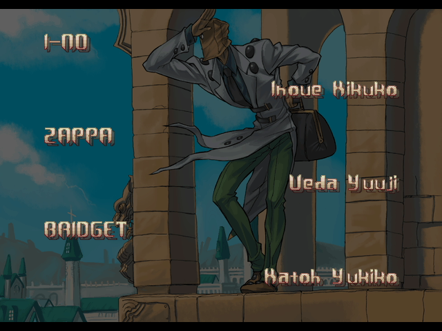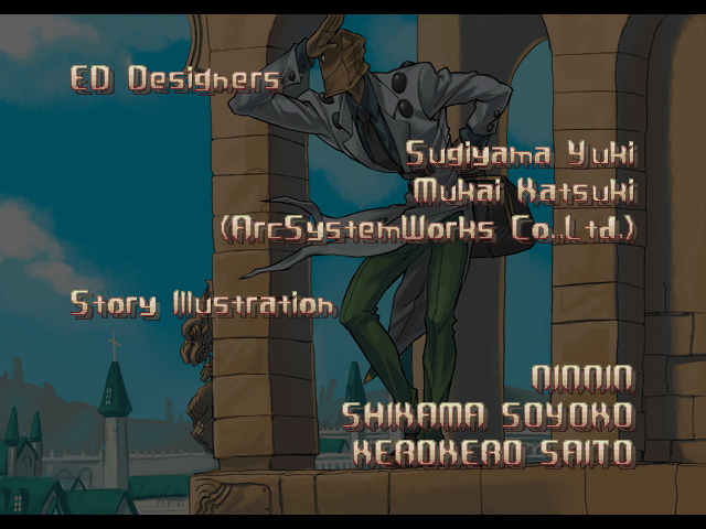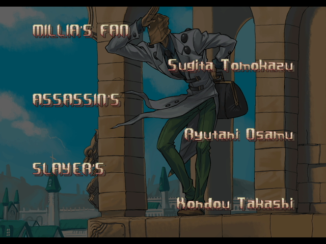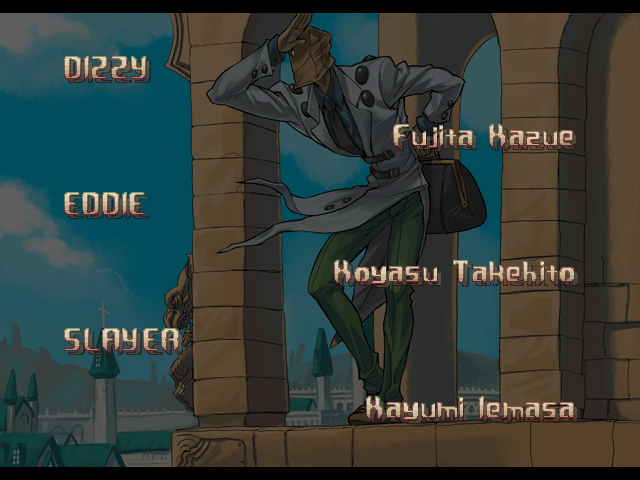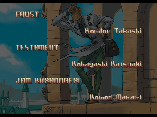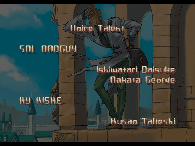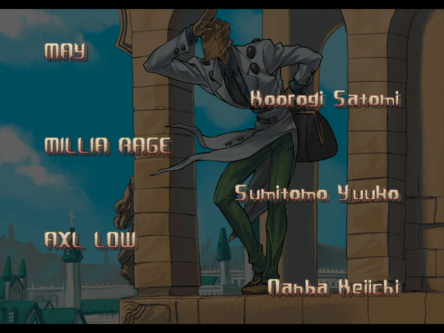 | - If Your Final Opponent Is Slayer - | If Your Final Opponent Is Zappa | | A.B.A | Anji-Mito | Axl Low | Baiken | Bridget | Chipp Zanuff | Dizzy | Eddie | - Faust - | I-No | Jam | Johnny | Justice | Kliff Undersn | | Ky-Kiske | May | Millia Rage | Order-Sol | Potemkin | Robo-Ky | Slayer | Sol-Badguy | Testament | Venom | Zappa | | Arcade Mode | - Story Mode - | |