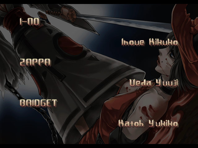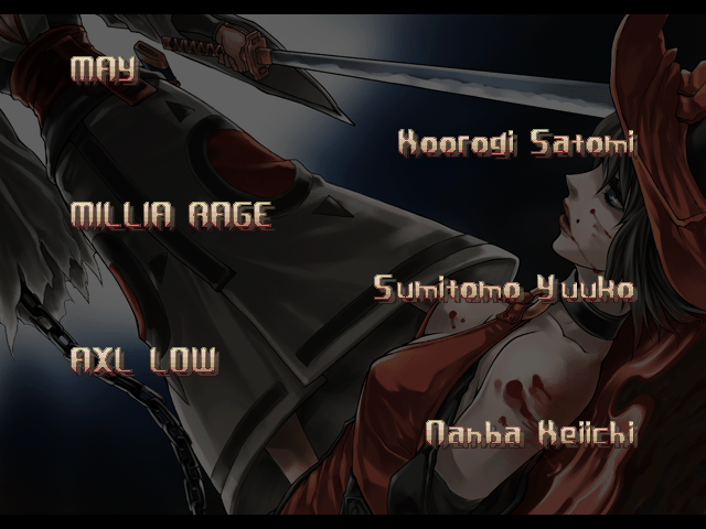 | If Your Final Opponent Is Anji Mito | - If Your Final Opponent Is Baiken - | | A.B.A | Anji-Mito | Axl Low | Baiken | Bridget | Chipp Zanuff | Dizzy | Eddie | Faust | - I-No - | Jam | Johnny | Justice | Kliff Undersn | | Ky-Kiske | May | Millia Rage | Order-Sol | Potemkin | Robo-Ky | Slayer | Sol-Badguy | Testament | Venom | Zappa | | Arcade Mode | - Story Mode - | |