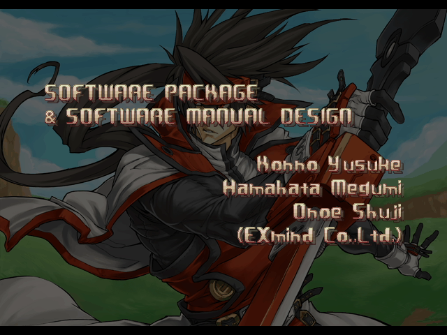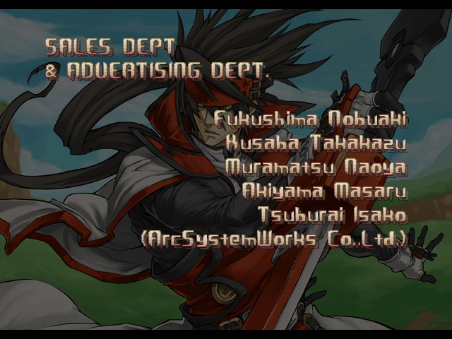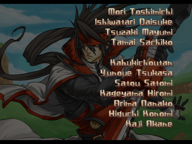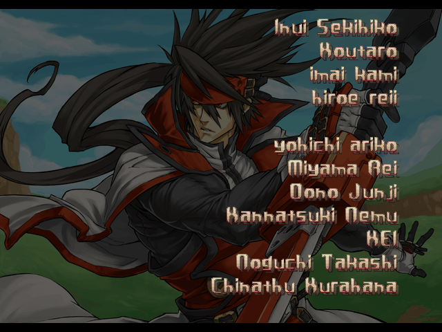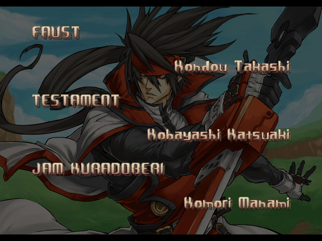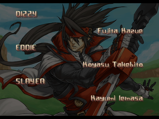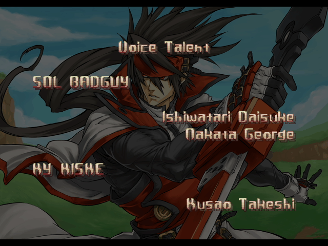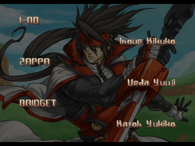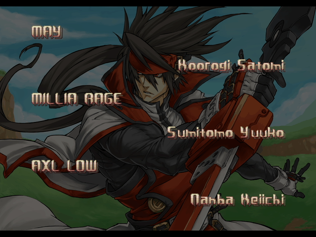 | A.B.A | Anji-Mito | Axl Low | Baiken | Bridget | Chipp Zanuff | Dizzy | Eddie | Faust | I-No | Jam | Johnny | Justice | Kliff Undersn | | Ky-Kiske | May | Millia Rage | - Order-Sol - | Potemkin | Robo-Ky | Slayer | Sol-Badguy | Testament | Venom | Zappa | | Arcade Mode | - Story Mode - | |