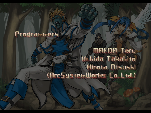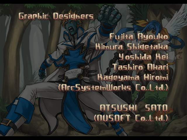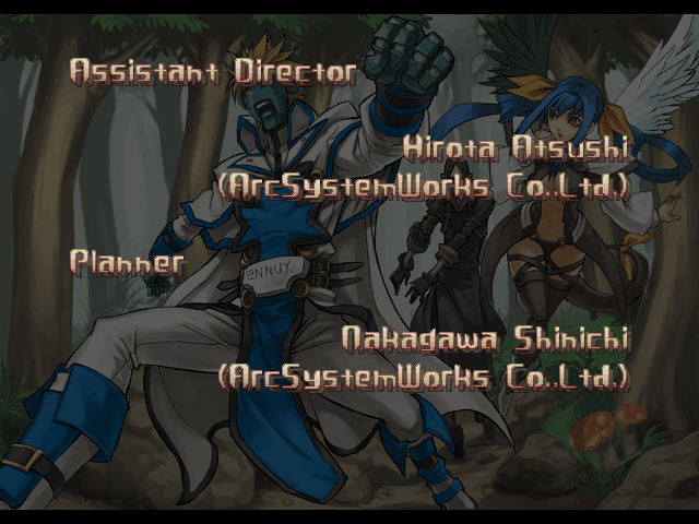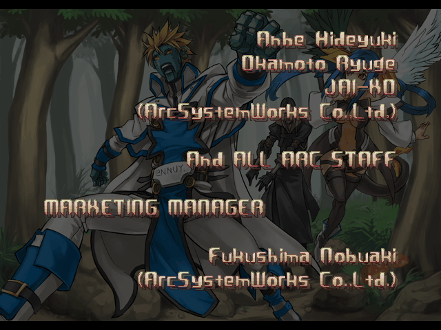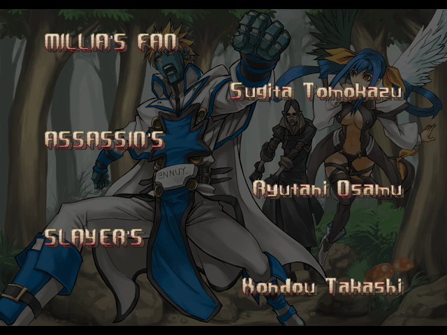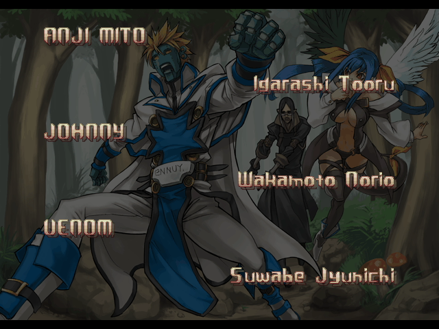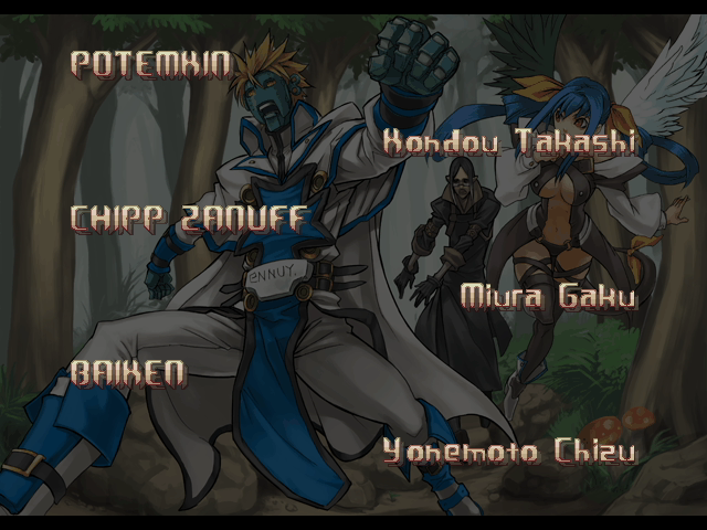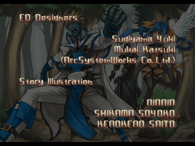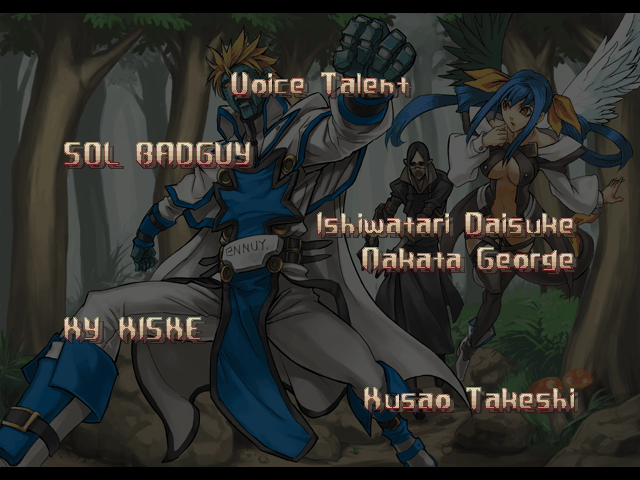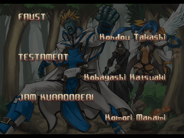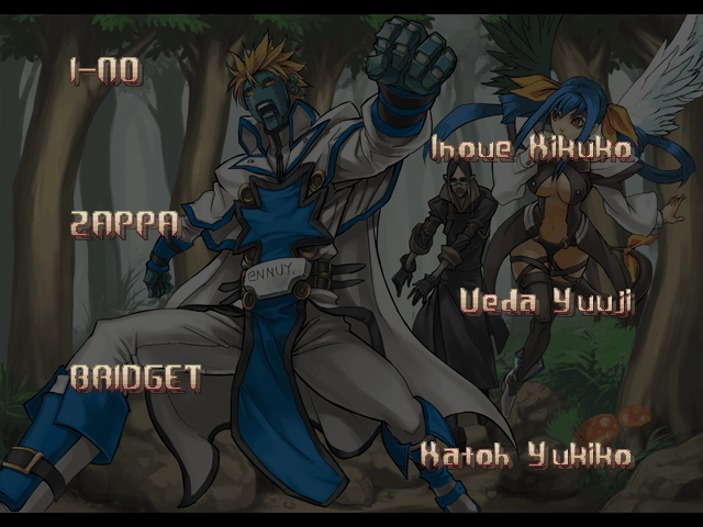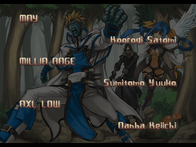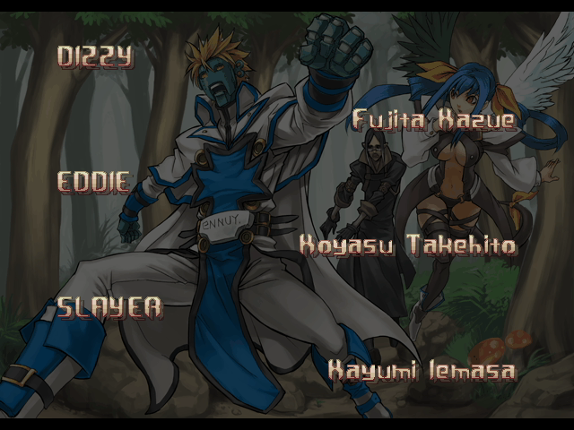 | If Your Final Opponent Is Justice | - If Your Final Opponent Is Dizzy - | | A.B.A | Anji-Mito | Axl Low | Baiken | Bridget | Chipp Zanuff | Dizzy | Eddie | Faust | I-No | Jam | Johnny | Justice | Kliff Undersn | | Ky-Kiske | May | Millia Rage | Order-Sol | Potemkin | - Robo-Ky - | Slayer | Sol-Badguy | Testament | Venom | Zappa | | Arcade Mode | - Story Mode - | |