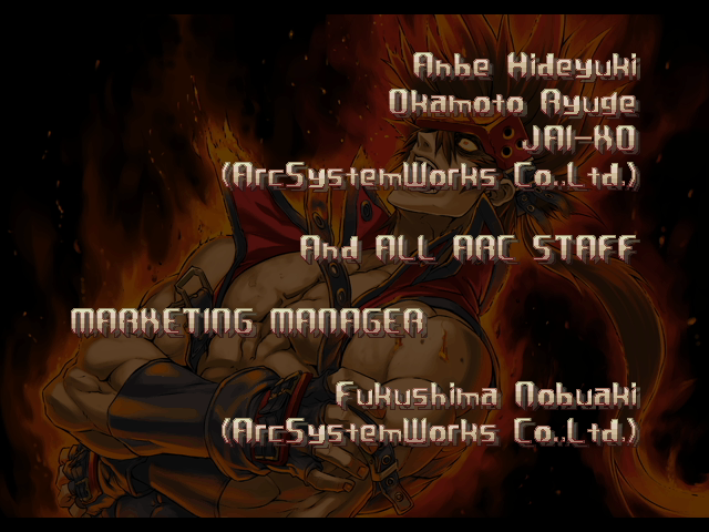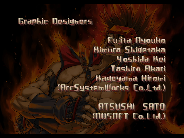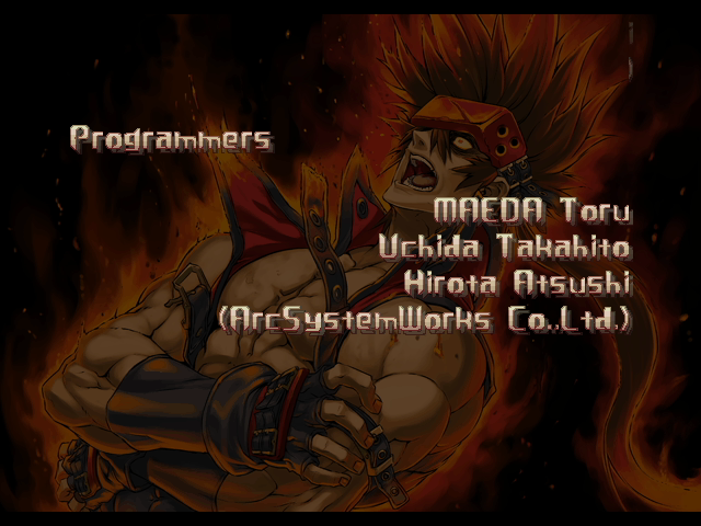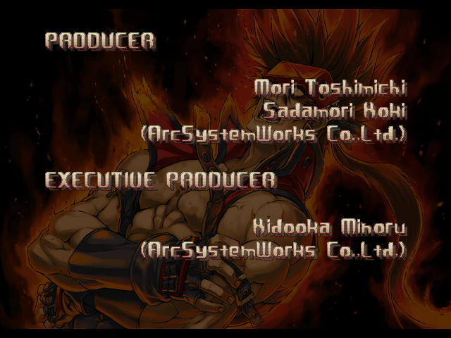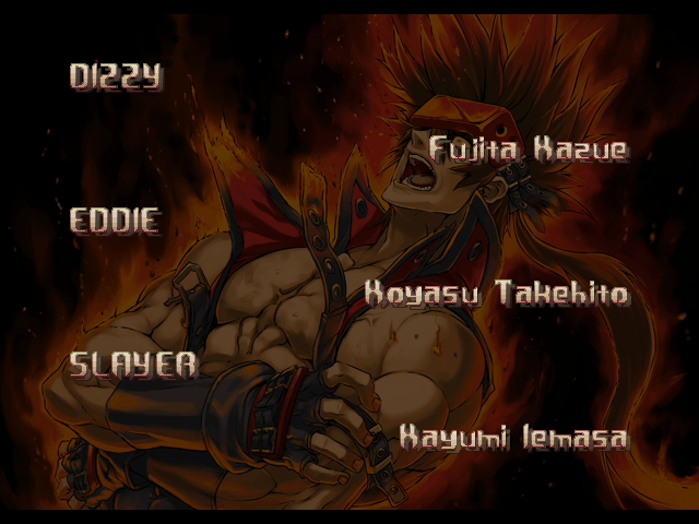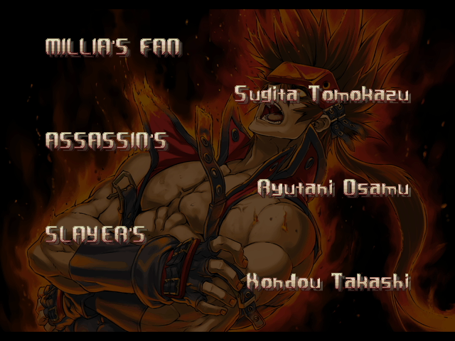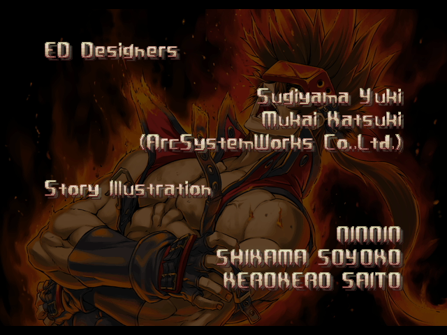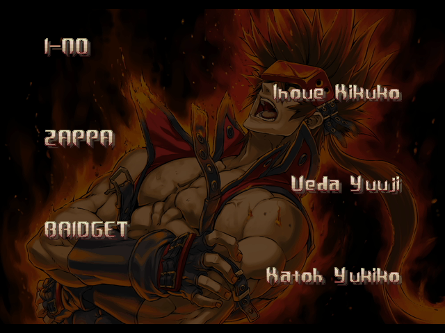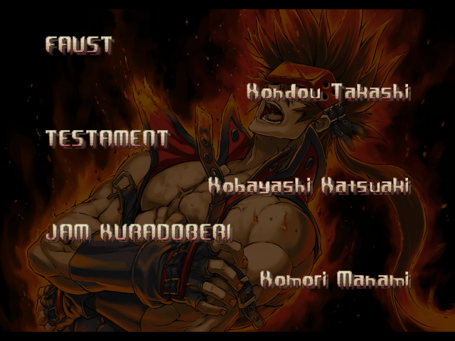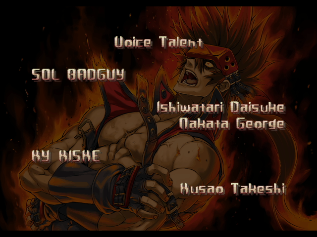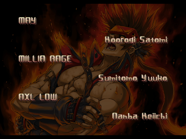 | If Your Final Opponent Is Ky-Kiske | - If Your Final Opponent Is Order-Sol - | | A.B.A | Anji-Mito | Axl Low | Baiken | Bridget | Chipp Zanuff | Dizzy | Eddie | Faust | I-No | Jam | Johnny | Justice | Kliff Undersn | | Ky-Kiske | May | Millia Rage | Order-Sol | Potemkin | Robo-Ky | Slayer | - Sol-Badguy - | Testament | Venom | Zappa | | Arcade Mode | - Story Mode - | |