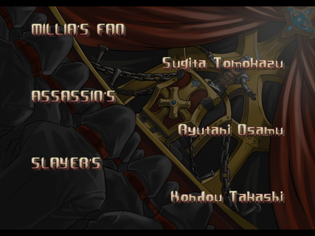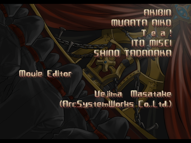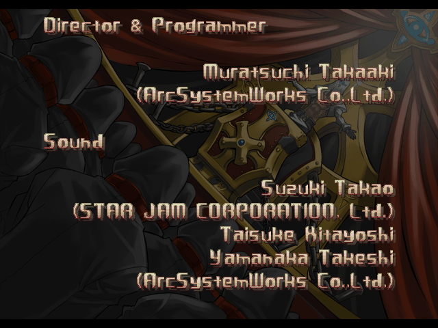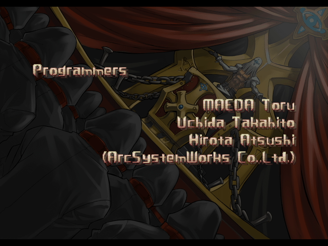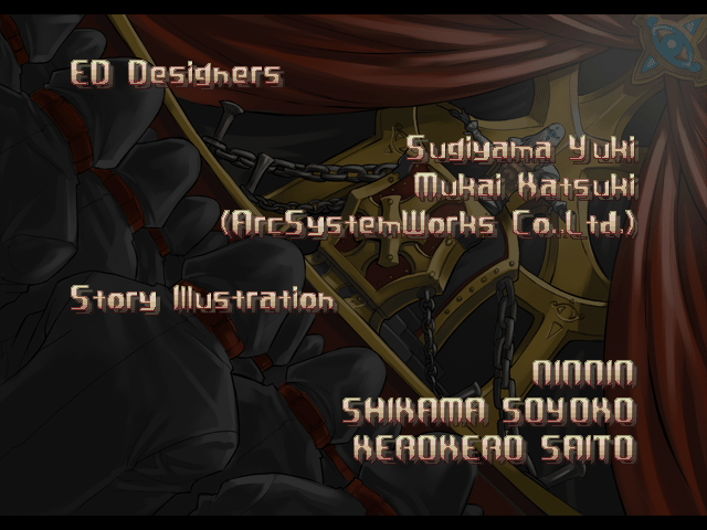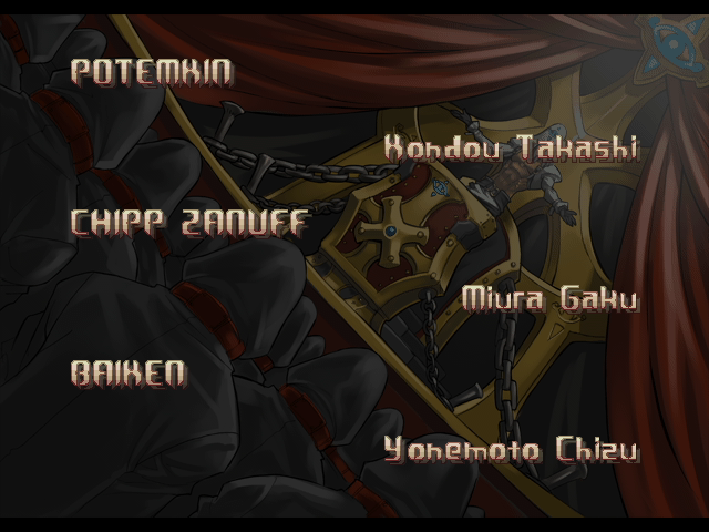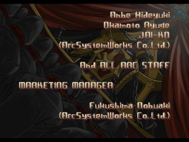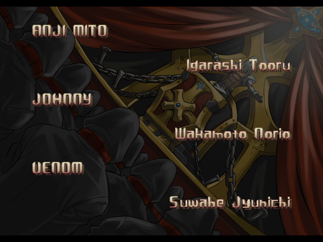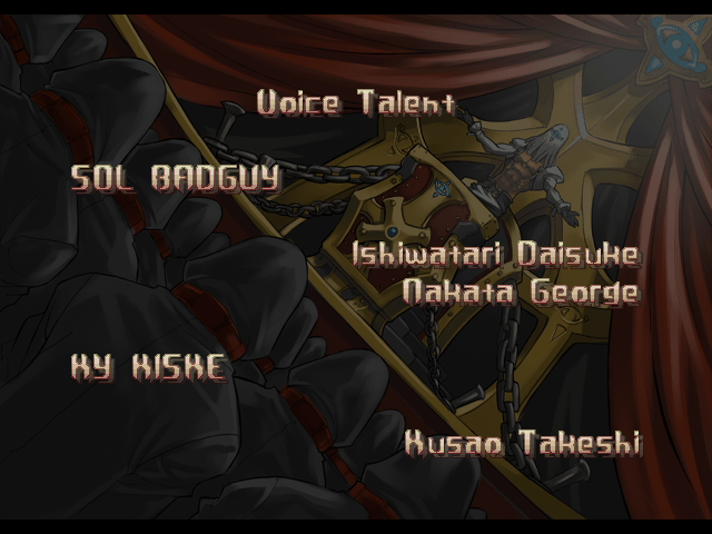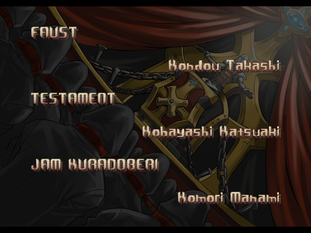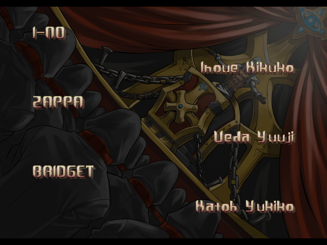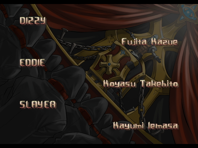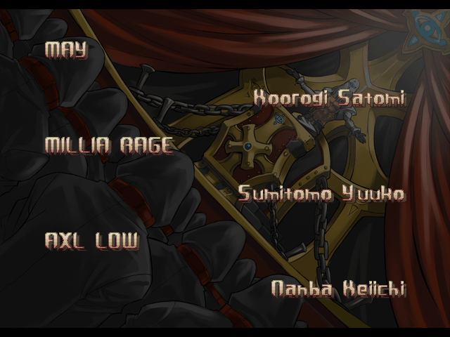 | - If Your Final Opponent Is Eddie - | If Your Final Opponent Is Justice | | A.B.A | Anji-Mito | Axl Low | Baiken | Bridget | Chipp Zanuff | Dizzy | Eddie | Faust | I-No | Jam | Johnny | Justice | Kliff Undersn | | Ky-Kiske | May | Millia Rage | Order-Sol | Potemkin | Robo-Ky | Slayer | Sol-Badguy | Testament | - Venom - | Zappa | | Arcade Mode | - Story Mode - | |
