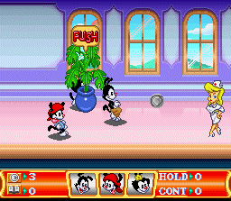 | Pinky and the Brain have stolen an Oscar winning script, but somehow it's managed to get scattered into pieces around the Warner lot. Go figure. Anyway, the chairman of Warner Bros. asks the Animaniacs to go retrieve the pieces from each section of the lot, which essentially means this is a "play a level, get a key item at the end" kind of game. Note that despite being made by the same company and featuring a similar "look", the SNES version of Animaniacs is a much more straight action game than the Genesis version, which is focused more on an action/puzzle mix.