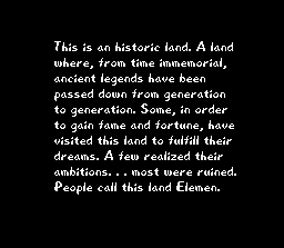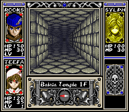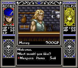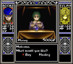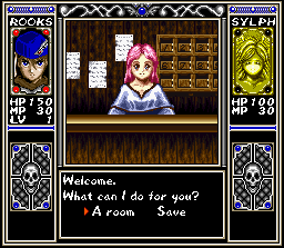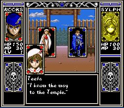 | Early SNES RPG which puts you in the role of Rooks, a Card Master who basically spends the game righting wrongs and defeating evil. The story is more or less nonexistant. Due to the "card master" theme, every character, enemy, NPC, and even every treasure chest takes the form of cards. Whether this is because the world is populated by walking, talking cards or because the designers didn't want to bother making sprites of actual people standing around is anyone's guess. The entire game takes place either in a town or in a dungeon; there is no walking around on the overworld map or visiting new places. Your party consists of three characters and an elemental card, which serves mainly as the mage of the group. Dungeons (of which there are a total of five) are long, complex, and tedious, but you are given an automap feature to make it a little easier.