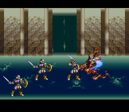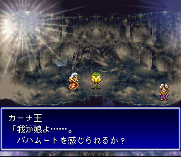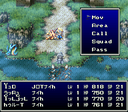 | A good strategy RPG from Square that never made it to the States. You take the role of Byuu, a knight in the Kahna Dragon Squad. Your team is going against a corrupt (aren't they all?) empire under the control of the evil Granbelos. As with most other Square games, Bahamut Lagoon starts with a simple good vs. evil premise such as this and then expands it with twists, turns, and a variety of characters. Battle is typical strategy fare, with two interesting expections: One, each player is partnered with a computer-controlled dragon, which will attack on its own and can be fed outside of battle to increase its strength and mutate it into a bigger, better beast. Two, terrain plays a role in combat, as ice spells can freeze over rivers to allow crossing, lightning spells can destroy certain terrain, and so on. On a side note, I think this is the most transparency-heavy game I've ever seen. Nearly every screen is shrouded in fog or haze or a rainbow effect or something. And people say Square only started going heavy on graphics in the PSX era.