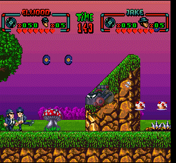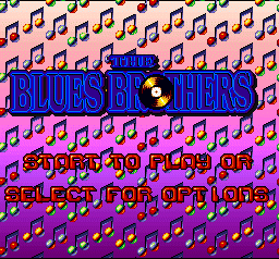 | Weak platformer based on the Saturday Night Live skit and subsequent movie. In one player mode, you can choose between Jake (fast, but can't jump high) and Elwood (slow, but can jump high), or you can control one and a friend controls the other in 2 player simultaneous mode. Run and hop around 34 levels in single player or 25 levels in two player, collecting pieces of records to throw at enemies in an attempt to reach the end of the level.