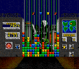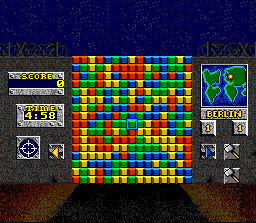 | Most modern gamers will recognize this as a precursor to Bejeweled. You're given a large wall of colored blocks, and you must empty the screen to beat the stage. This is done by finding blocks that have 2 or more of the same color right next to each other and clicking on them, making them disappear. One's only hope of beating a level is to remove smaller collections of blocks to let big collections to fall into place, allowing you to remove large sections of the wall at once. Supports the SNES mouse.