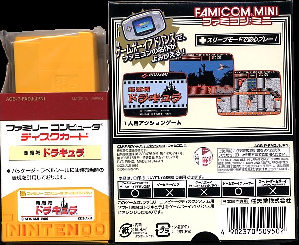 Volume 29 of the Famicom Mini Series is Akumajou Dracula, the Japanese rendition of the hit Castlevania. The packaging includes the clear-plastic outer box, which lets us view the inner cart-box-holding insert. Once you pull out the insert, you'll find the cart box, which itself has a front and back cover. Inside this box is the actual cart.