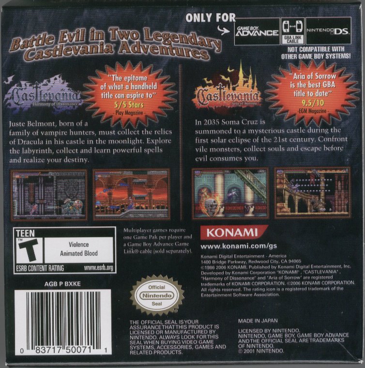 The Castlevania Double Pack, released in January of 2006, is a simple collection of two GBA titles: Castlevania: Harmony of Dissonance and Castlevania: Aria of Sorrow. Its release, it seems, is geared more toward introducing newer handheld-gaming consumers to the two titles that led to creation (influence- and formula-wise) of Castlevania: Dawn of Sorrow for the DS. Why Castlevania: Circle of the Moon is exempt is simple: This title was created by the now-defunct KCEK, previous to Koji Igarashi's regime, and the current director wishes to strike it from the series' canon. (The scanned box covers for the U.S. version were provided by Insanitist and the cart by Keith.)