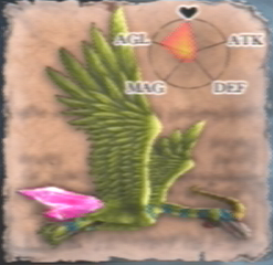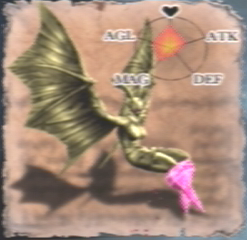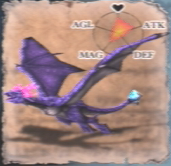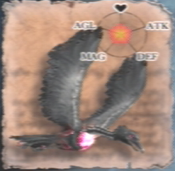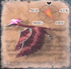 "A winged dragon instilled with the power of fire. Reduces everything to ash with its Flames of Hell." Crimson as a fighter is nothing more than Indigo in a fiery skin. It has all of the same dive-bomb attacks and, like Indigo, can retain all of Skull Wing's special abilities. Even its new abilities are altogether similar to Indigo's: The Ignition Blow releases toward enemies heat-seeking balls of flame, and Flame Breath, which is spewed out in a similar giant ray yet its effect purely destructive. While it has the same heart potential, it differs from Indigo in statistics, where it's beat in terms of strength but superior in magic and how its abilities deal more devastation. Deciding between the two is at best a toss-up. |