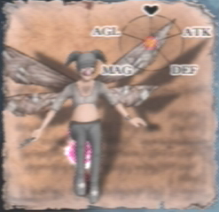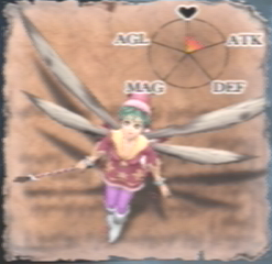 Innocent Devils subsist on the heart meter found below Hector's; it's both their life-force and the power source for their many abilities. If it drains down to nothing, the I.D. will find itself banished and can only return when Hector collects about twenty hearts or so. The heart meter of course grows larger as the I.D. gains levels, and it does so according to the its heart-potential, which is one of five areas in which I.D.s are gifted. This includes Heart-Potential, which affects how much of a boost the heart meter receives due to level gains; Agility, which gives you an idea of its speed and movability; Attack, which measures its physical strength; Magic, which impacts the deadliness of its spells and abilities; and Defense, which tells us much about its endurance relative to its heart meter.