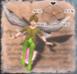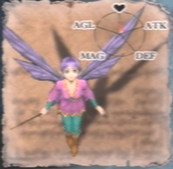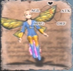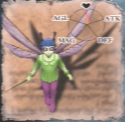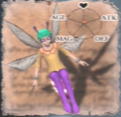 "A fairy with a leaf for a hat. Desires only to live a simple life. Attracted to beautiful decorations." The Infant Fairy's evolution into a Leaffle represents a slight jump. Leaffle is largely the same Innocent Devil you knew from the previous fairy form, but it's usefulness will be bumped up a bit when it learns its Poison Power ability, which is to Leaffle free to use and will thus become its recurring attack; it will target one or multiple enemies and spray them with poison mist, at which point they will continue to lose small amounts of energy until the poison's effect wears off. You'll find, through gaining levels, that Leaffle has high heart potential, which is good news for those who like to put Innocent Devils on "Auto." |
