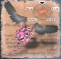 "A black bird said to feast on corpse flesh, and hated for it. Rumors of death follow in its path." The Crow, your basic bird I.D., has immediate value to the mission in that it has the Glide ability (an ability that all evolved bird forms retain), which is the only means of transportation that will allow Hector access to the Forest of Jigramunt and beyond. In the meantime, it serves pretty well as an offensive force against minor enemies. The Crow, which flies overhead at a safe distance, will use its small size and evasiveness to pester foes that never seem prepared for its assaults. The Crow has one attack that has to it some variation: That is, It will charge or dive-bomb at enemies in a sonic wave, its beak extended, and knock them back with sheer force; other times, the Crow will strike multiple times for repeated damage that quickly adds up to enemy defeat. Due to its speed and small size, which makes it less of a target, it's a rare event when the Crow receives damage. |