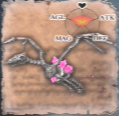 "Comprised of fleshless bones, this winged dragon is presumed to be a relative of skeletons." Likewise, the Skull Wing is derivative of the crow in its basic movements and attacks, which include the very same dive-bombs and their variants. Though Skull Wing doesn't have the heart potential or the endurance of a Goldfinch, it's on par agility-wise and its attacks pack more of a punch. It's a tradeoff, really--it's Carpet Bombs ability is similar to Caltrops, but this version sees Skull Wing drop bone-bombs one-by-one according to its current flight pattern. Giving it a slight edge, perhaps, is the Bone Shot, which is similar to Corpsey's Bone Storm in how it targets multiple foes and weakens them for Hector. |