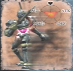 Provided below is a detailed look at the six I.D. types. I'll first show a chart and explain its manner of branching and give an overall view of the of the I.D. class it governs. Listed thereafter is each class member (according to tier, starting from the bottom and moving up from left to right); its effect on Hector's statistics; the crystals needed to evolve toward it plus any special means of attaining said crystals; its behavior on the battlefield; its picture (with its superficial stat meter); and finally its abilities, how they're earned, and what they accomplish. Now, it should be noted that there is no static form for a final-tier I.D., as spells and abilities can carry over according to your path of evolution, so you'll find three explanations for "availability":