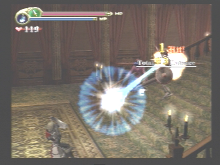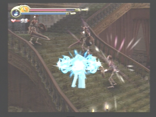 By defeating certain bosses, Leon will earn six multicolored orbs; the seventh orb is simply hidden like any other treasure. Orbs have the power to enhance the five mystic weapons to create item-crash-like effects. With seven powers available for each weapon, he has thirty-five possible combinations. By pushing "O" when an orb is selected, Leon will automatically use the super attack for his currently-equipped mystic weapon, which will drain a larger-than-usual amount of hearts. In order to select an orb, you must utilize its own real-time window by holding the "L1" button; however, they can be arranged on the inventory screen for your convenience. First I'll present a normal table with descriptions and locations followed by screenshots of the orbs' effects in action.