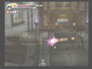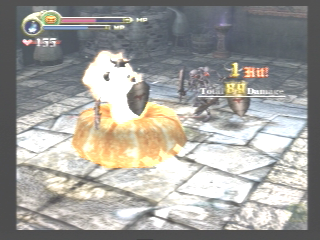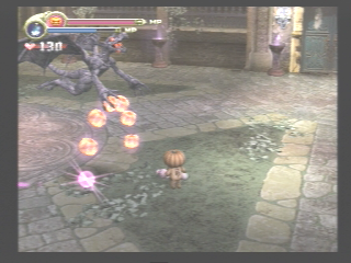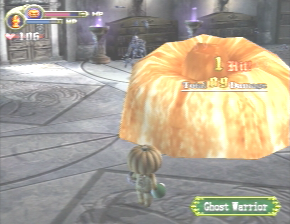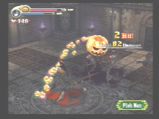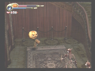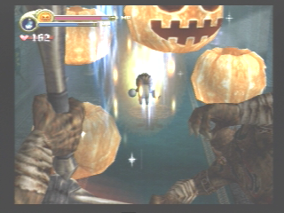 As mentioned on the first page: Pumpkin's mission is largely the same as Leon's even though the little guy has greater strength and all the whip combos to start the game. But Pumpkin has one other difference: Since it comes along with its own personal sub-weapon, a pumpkin that it can't lose, it can collect the seven orbs and use them to power the sub-weapon for seven exclusive attacks. The special attacks, of course, use a larger portion of its heart-total. The orbs must be selected in their own real time window, which will pop up when the "L1" button is held; however, they can be arranged on the inventory screen for your convenience.