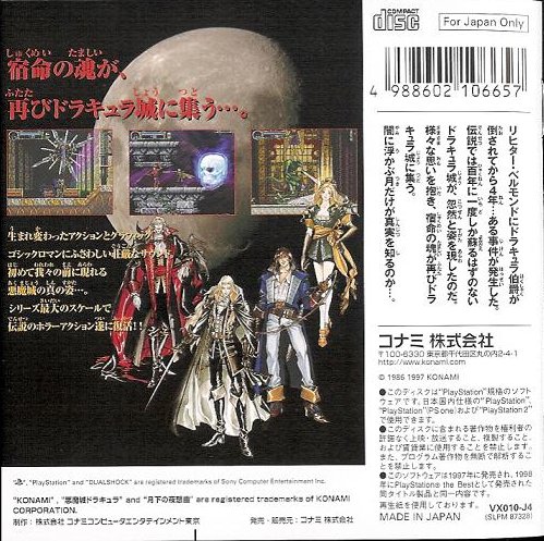 The PS1 Books version of Castlevania: Symphony of the Night recycles the very same Japanese manual. Scans provided are by Simon Belmont; the sender, Morgoth, explains the extra page included with the front and back covers: "The extra page not found in the original manual supposedly tells us about how Maria is playable in this version. It has not been confirmed yet if this is in fact true. The rest of the manual is the same, obviously."