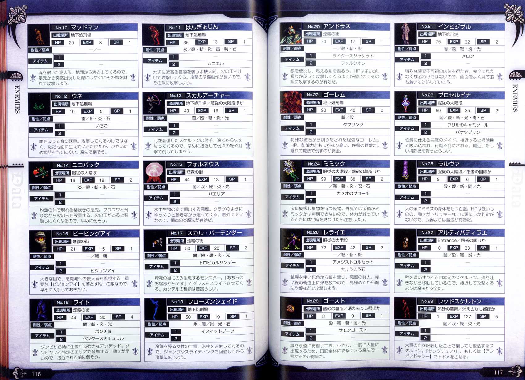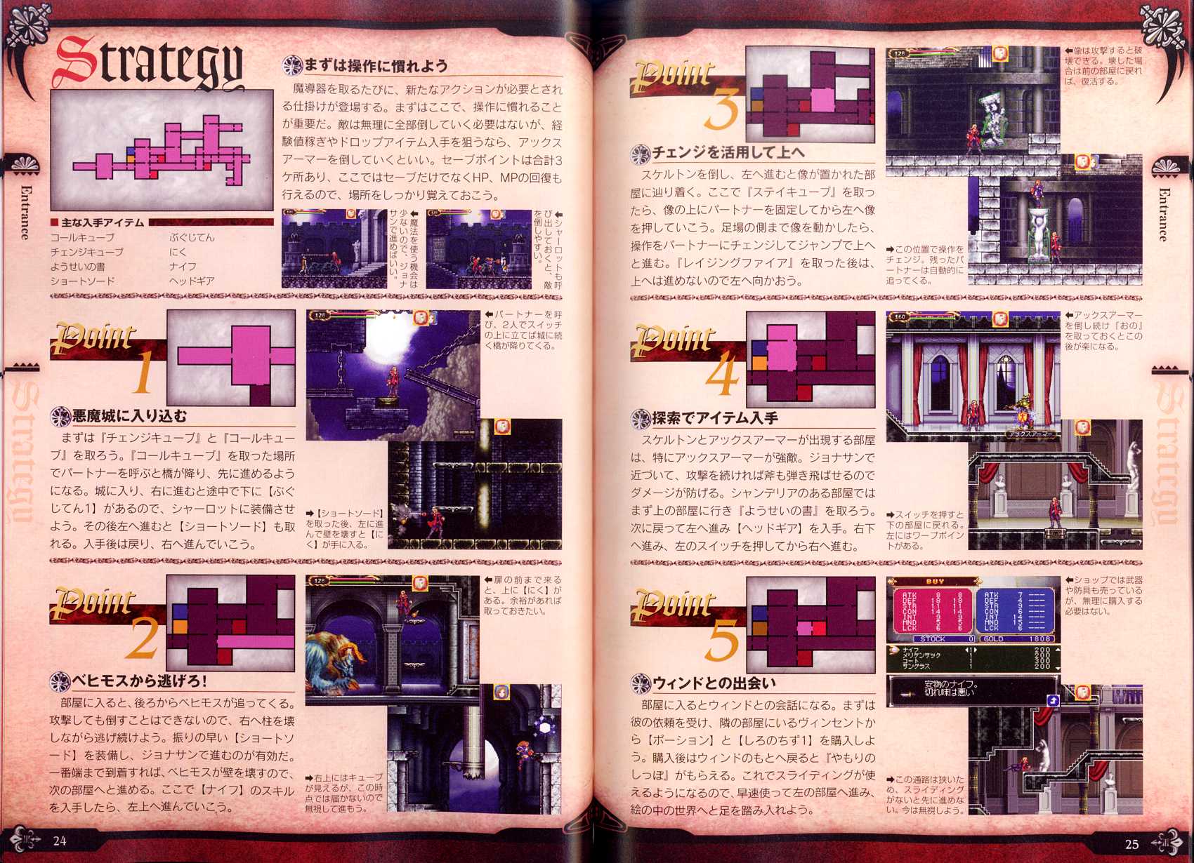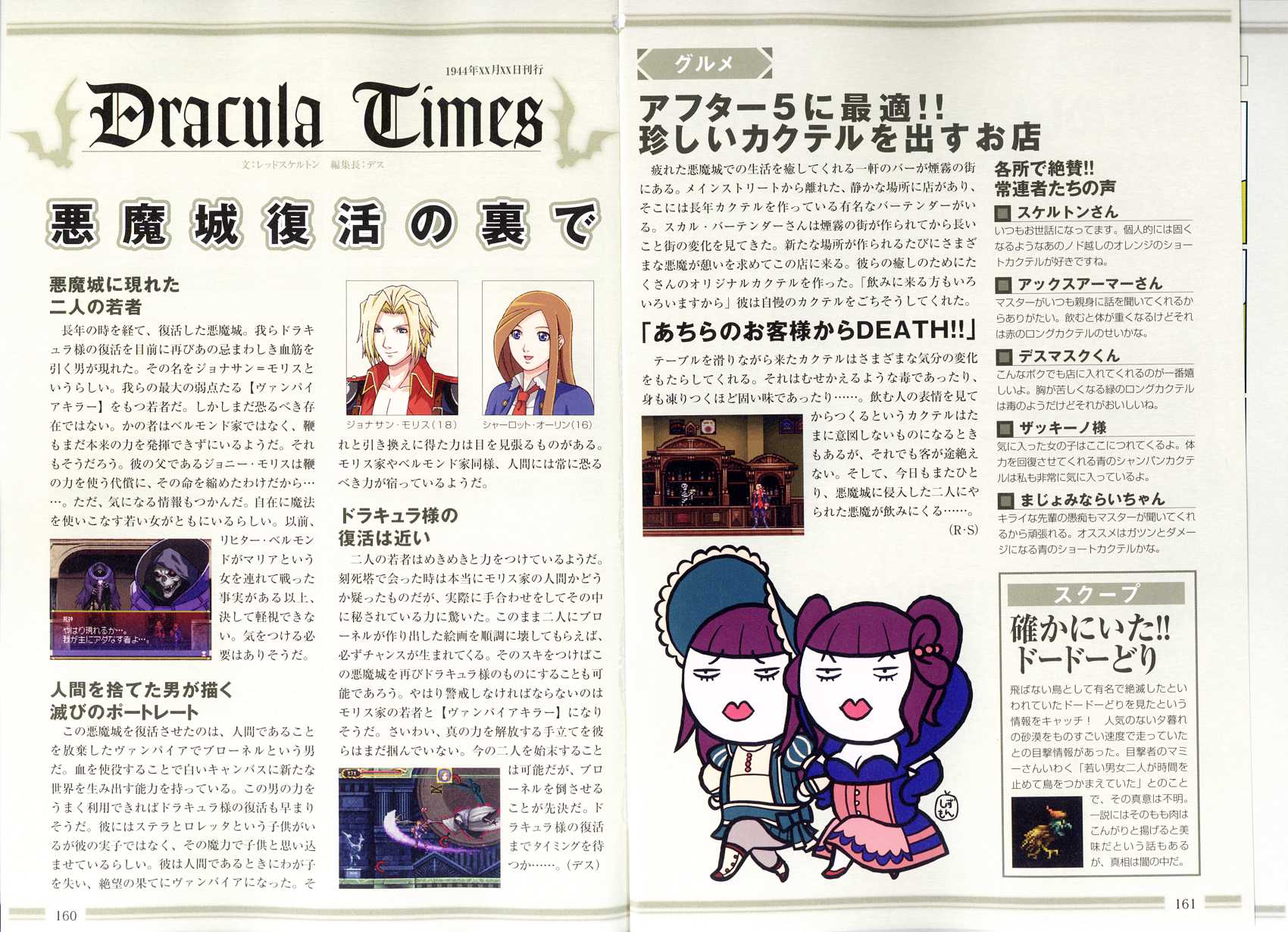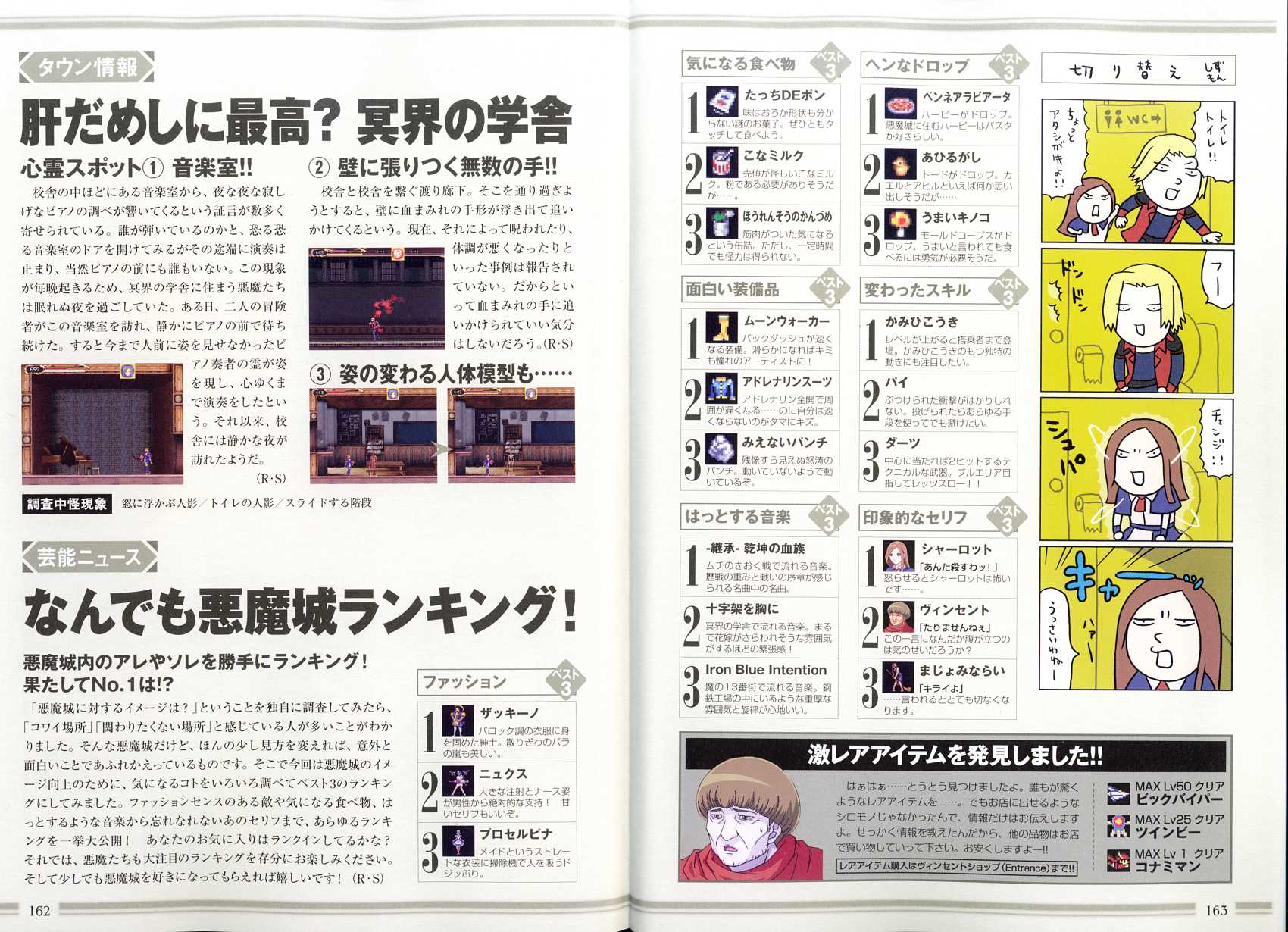 In addition to the special calendar, Konami created for Akumajo Dracula: Gallery of Labyrinth an official guide. This page contains shots of its front and back covers plus some samples taken direct from the hefty magazine. (All images have been contributed by JPCVFAN.)