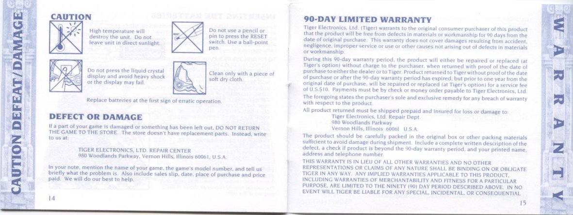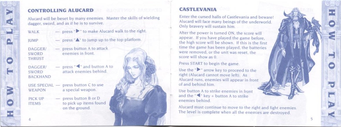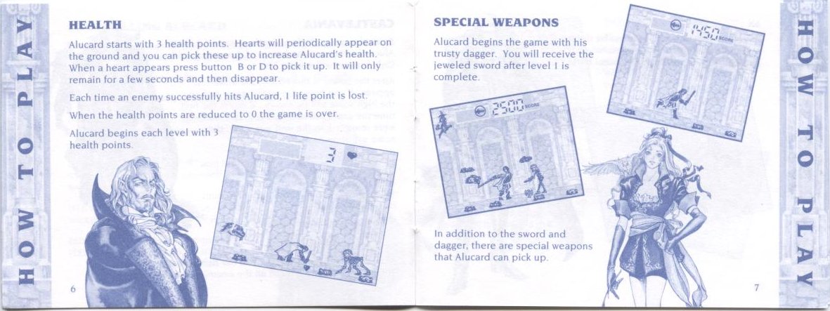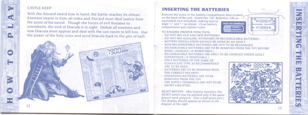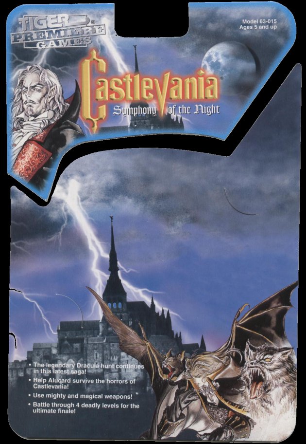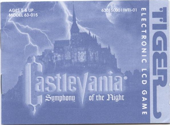 In 1998, Tiger released another handheld version of a Konami game--Castlevania: Symphony of the Night. While of course dumbed down due to the limitations of liquid crystal, this version is much more faithful to its inspiration than the previous Tiger release, Castlevania II: Simon's Quest. It contains sub-weapons, special attacks and a nice selection of enemies--all of which is illustrated in its 16-page manual. The following scans have been sent in by Morgoth: