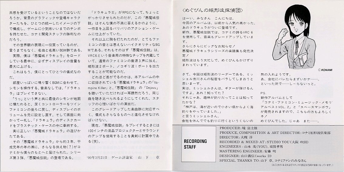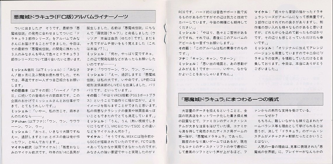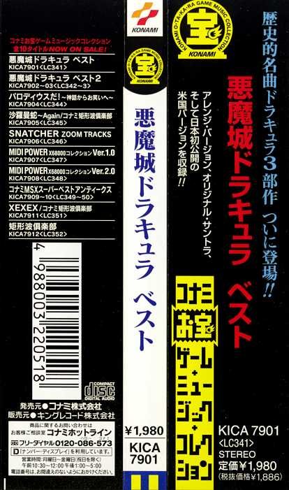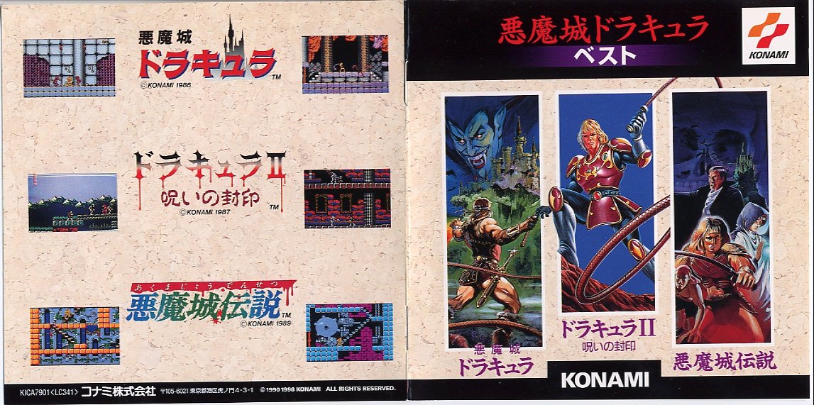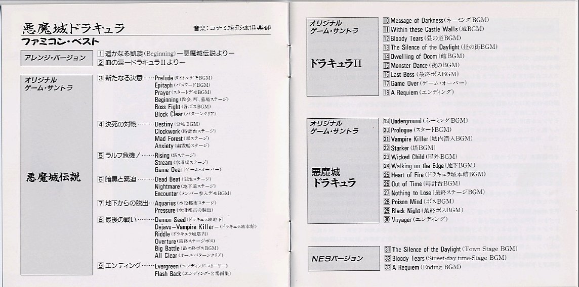 This CD, released in 1998, is titled Akumajou Dracula Best, and it's the complete collection of the soundtracks from the three Famicom titles: Akumajou Dracula, Dracula II: Noroi no Fuiin and Dracula Densetsu. We, of course, know them as Castlevania, Simon's Quest and Dracula's Curse.