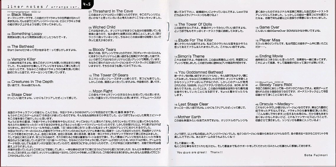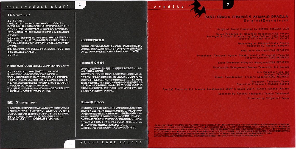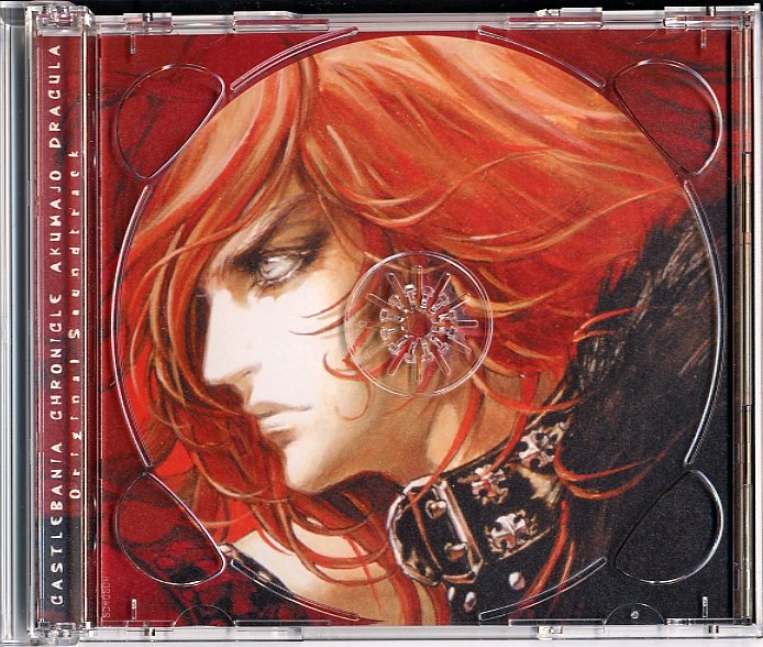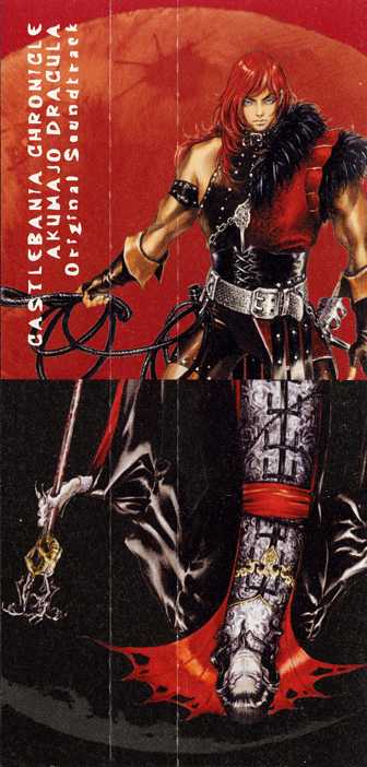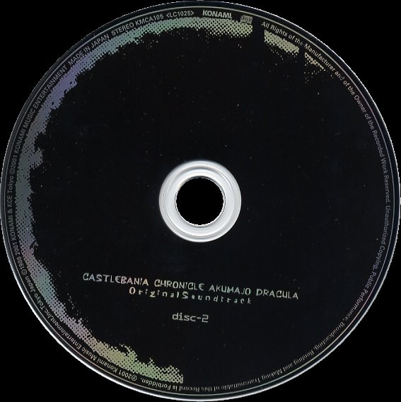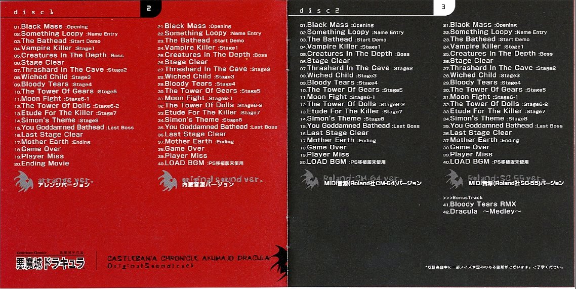 Its soundtrack contains two CDs and a booklet. Notes from the contributor, Carl: "(1) In Japanese, the sound of 'b' and 'v' is the same, and they often make errors writing these letters. So the cover reads 'CastleBania.' (2) The soundtrack is on two CDs because it has all four selectable soundtracks from the game: (a) the rearranged PSOne-only track, (b) the original X68000 chip soundtrack in-game, (c) the Midi Roland CM-64 version, and (d) the Midi Roland SC-55 version. All four music options are selectable in the PSOne Chronicles release."